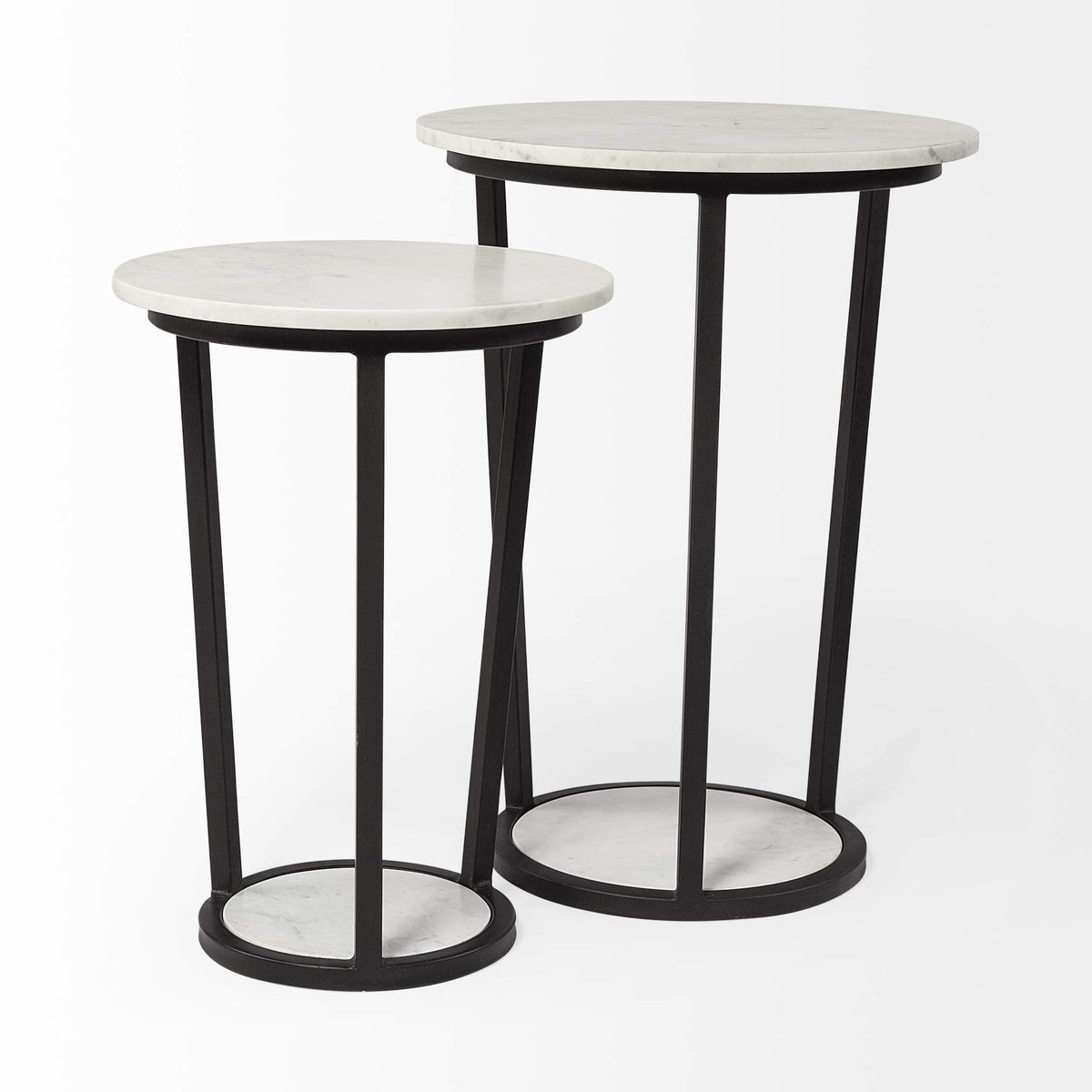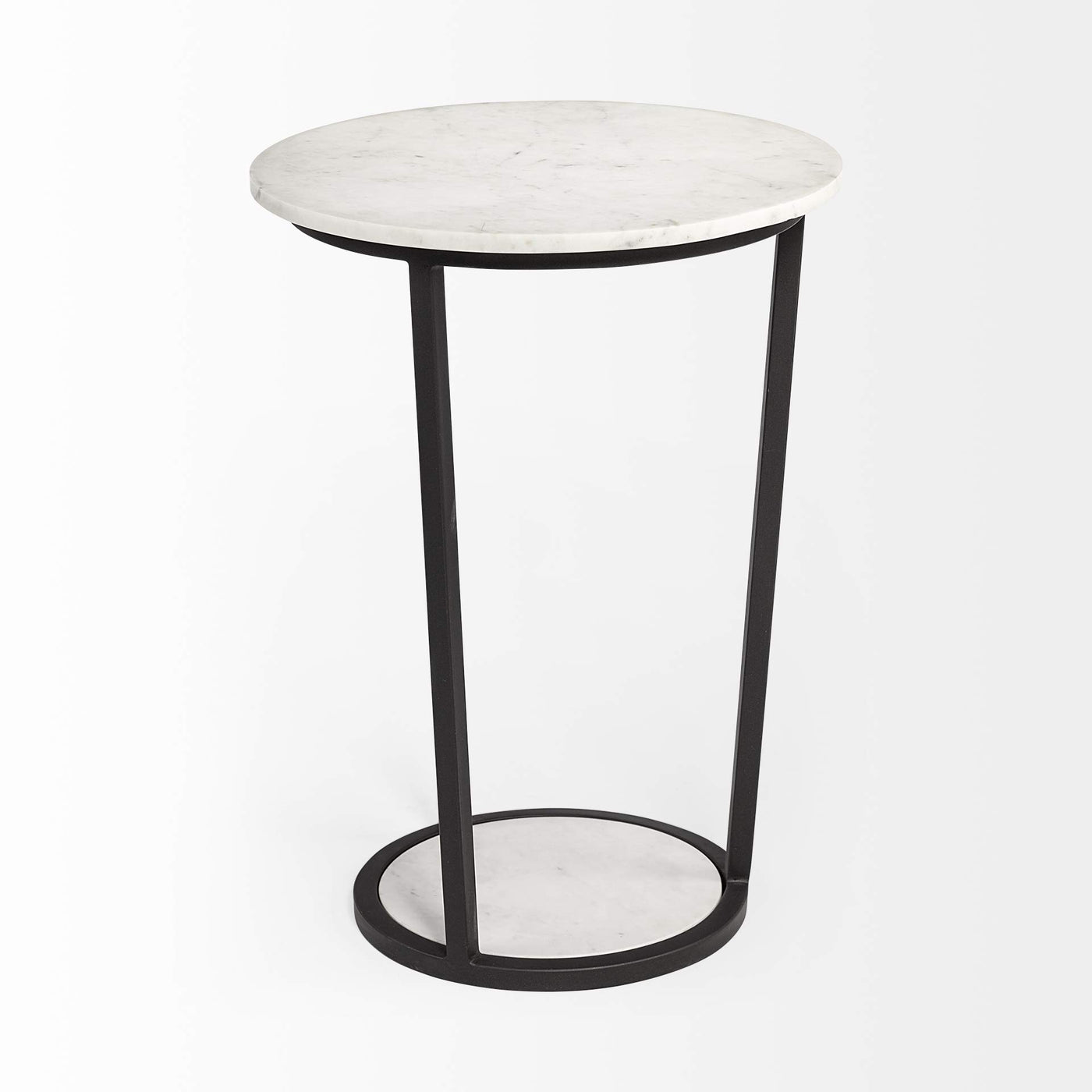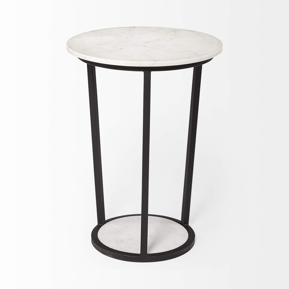 Featuring a round marble top that looks stunning, a metal table that is sure to make your space look radiant. The beautiful natural white marble top is supported by an angular and tapered frame that is polished in a matte black shade. This contrast of marble and metal tones is a great accent furniture option in spaces based on the design style.