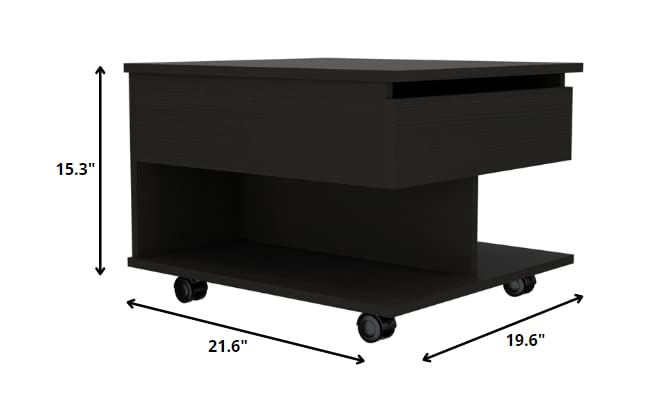 This handsome 22-inch Black Manufactured Wooden Rectangular Side Table with Drawer is not only practical but also good looking and built to last. This multifunctional coffee table is built to last with high quality particle board. This table is made of manufactured wood in black throughout the base and top. This rectangular table will be a great accent in any room. The black coloring gives this piece an updated and refreshing look. The wheels give the table greater versatility and mobility if necessary. It has a charming design that will definitely breathe some fresh air inside. This side table is the sturdy, reliable and stylish answer to your living room needs. 15.3"H x 21.6"W x 19.6"D