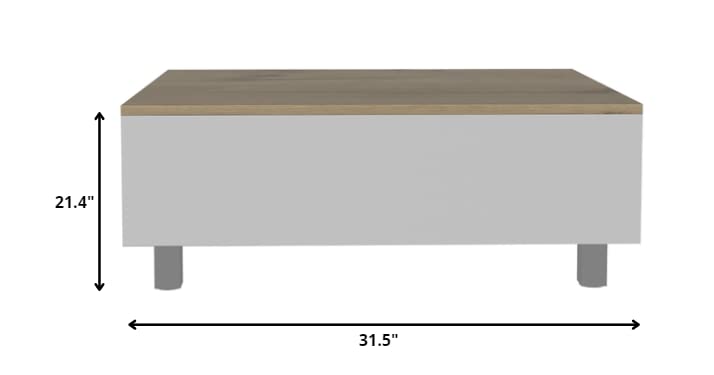 HomeRoots 32" White and Light Oak Manufactured Wood Rectangular Lift Top Coffee Table with Drawer and Shelf