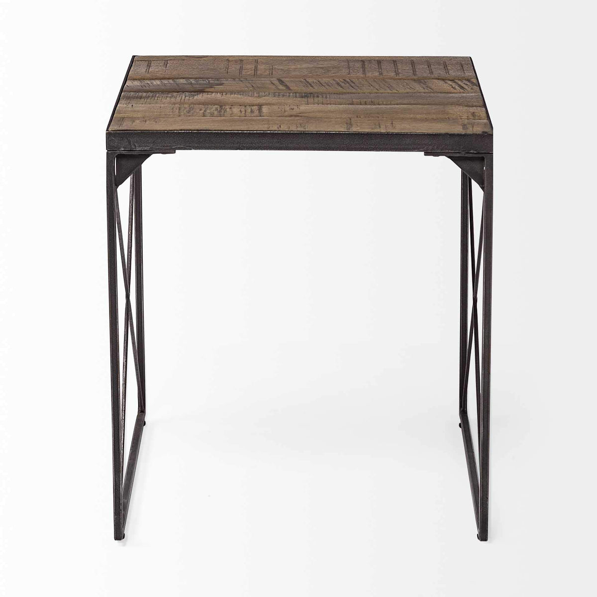 HomeRoots Black Metal Medium Brown Wood Side Table with Square Top and Iron Cross Braced