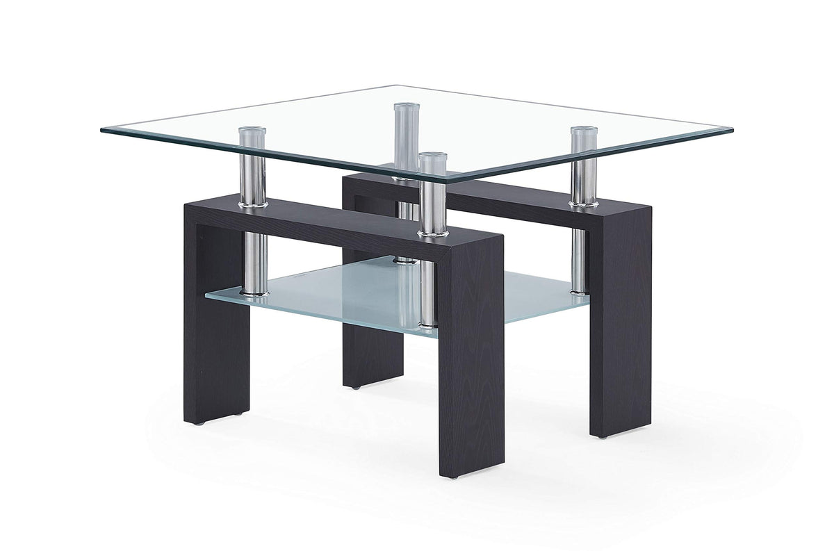 This table is complete with clear top glass and frosted bottom glass with dark walnut legs to finish the look. Specifications. Color Dark Walnut. Style Contemporary. Assembly Required Yes. Material Glass, Metal, Wood. Dimension 26 W x 26 D x 18 H. Weight 30 lbs