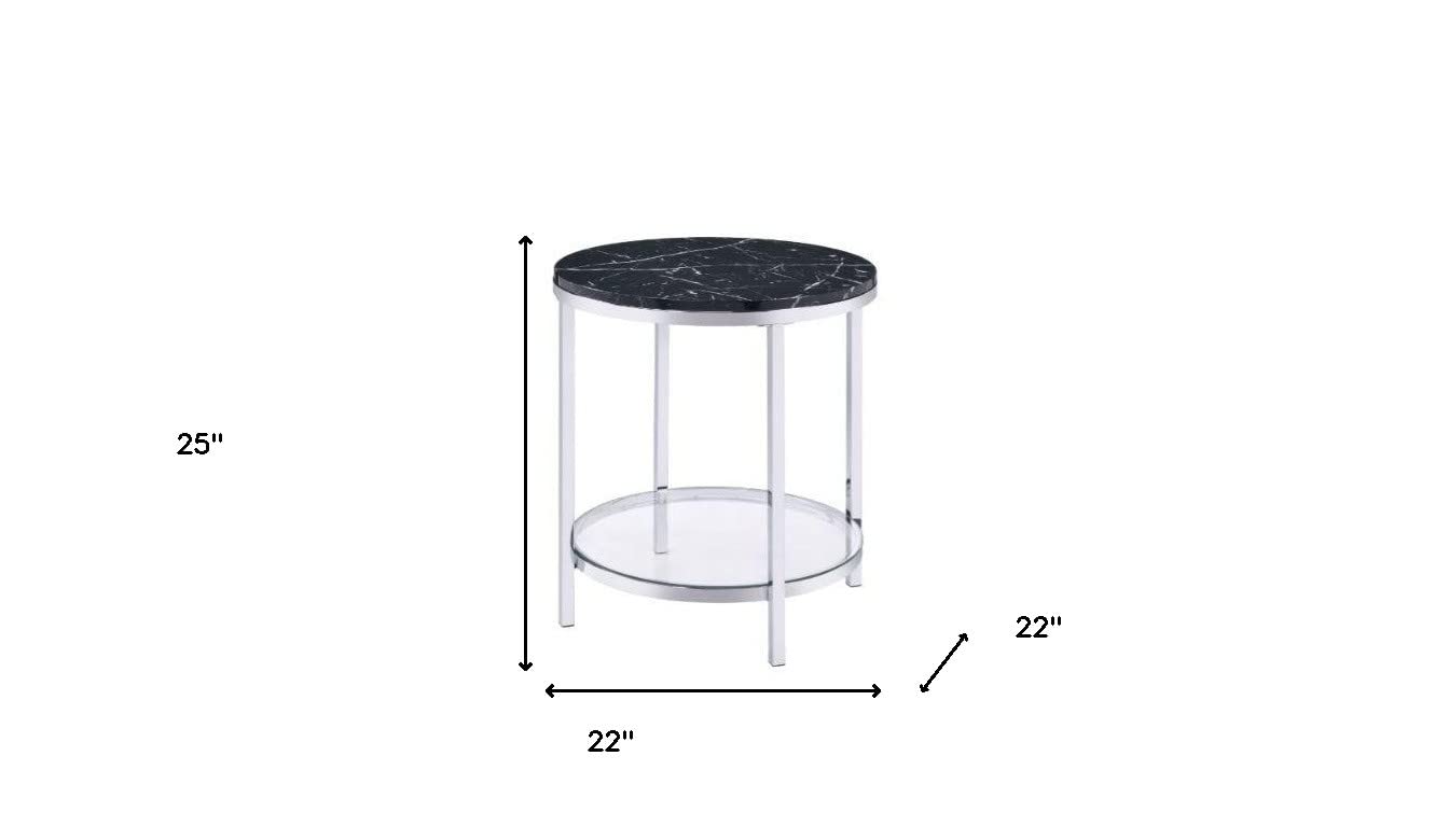 HomeRoots Faux Black Marble & Chrome 25" Chrome and Black Faux Marble and Metal Round End Table with Shelf