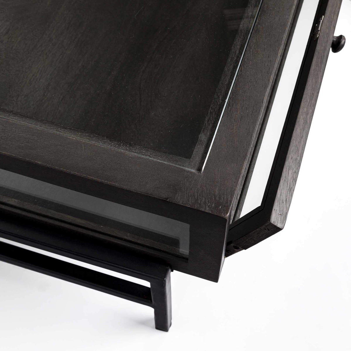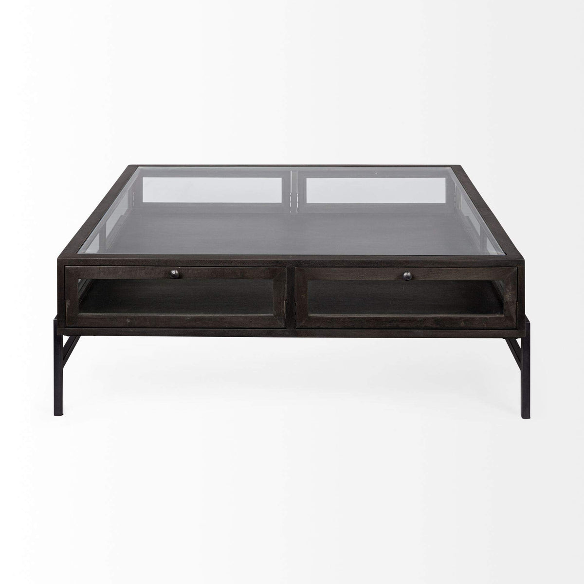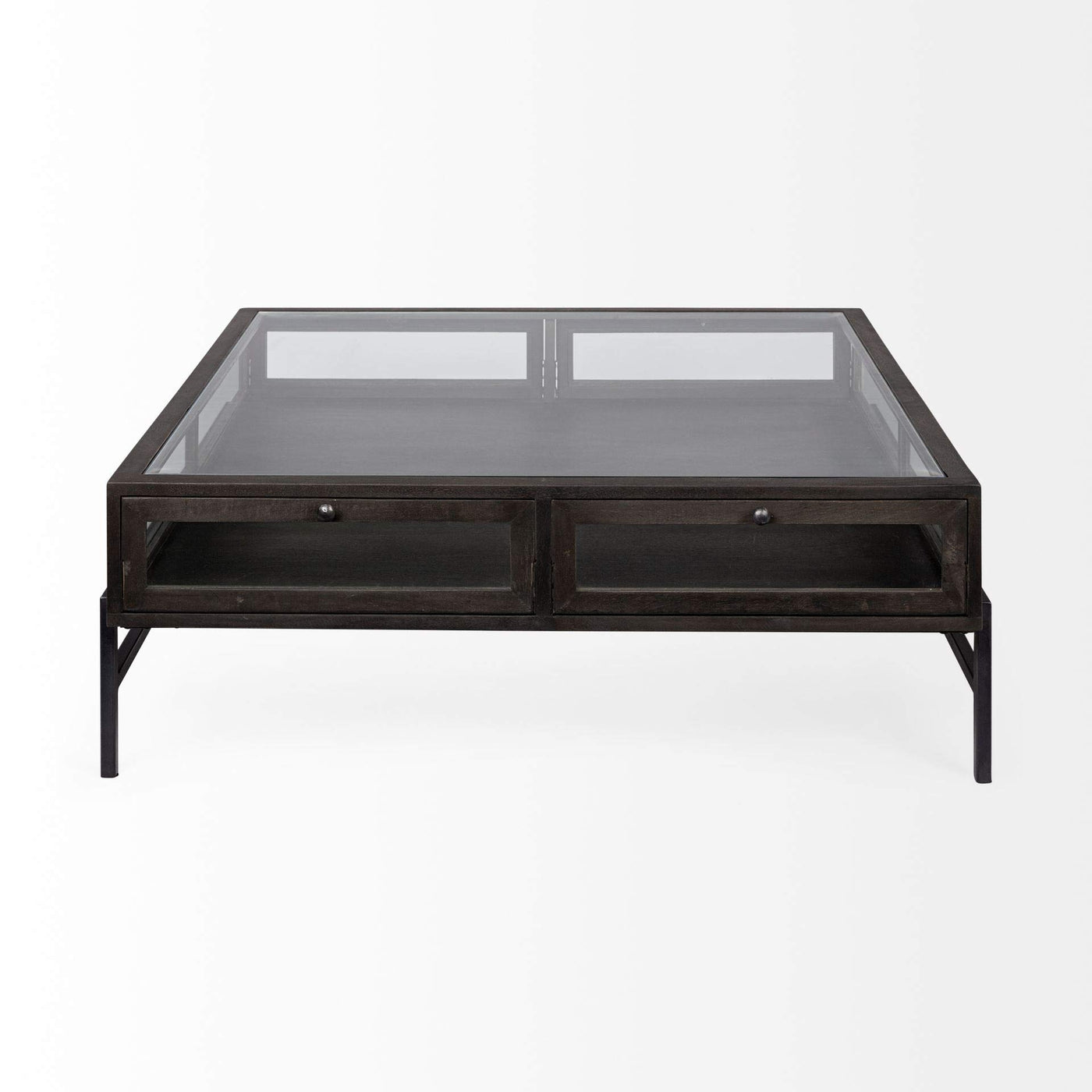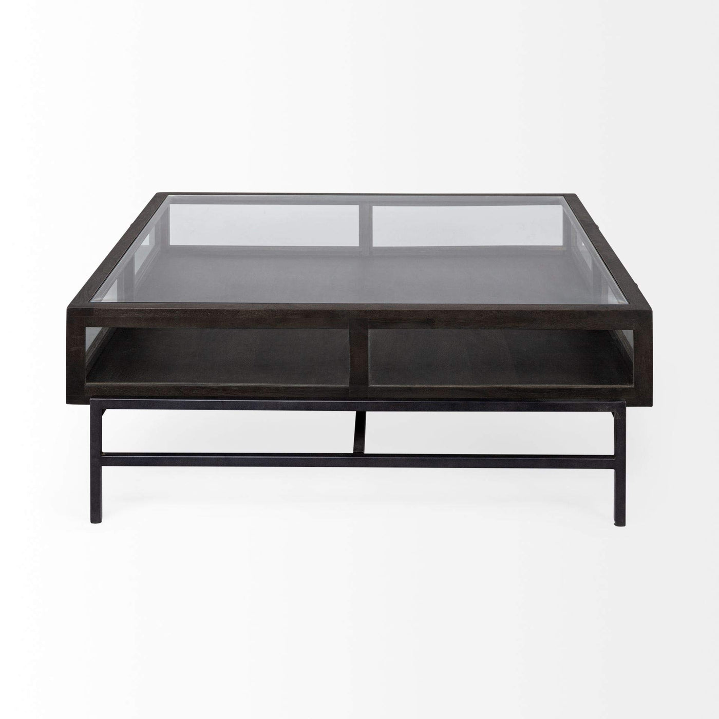 Featuring A Square-Shaped Chassis That Is Meticulously Crafted From Premium, Black-Toned Indian Mango Wood, Is A Spectacular Coffee Table That Is Just As Functional As It Is Visually Appealing. Equipped With Glass Side Panels And A Clear Glass Top With Storage Underneath, Offers Ample Space For A Plethora Of Everyday Items And Is Also Great For Displaying A Mix Of Your Favorite Decorative Objects. The Wooden Chassis Is Perched Atop A Matte-Black Toned, Four-Legged Solid Iron Base With Cross Bracing Which Not Only Adds To The Visuals Of This Piece But Also Stabilizes The Cabinet To Perfection. With Its All-Black Finish And Functional Design, Is Guaranteed To Look Great In Spaces Based On The Modern And Industrial Design Styles.