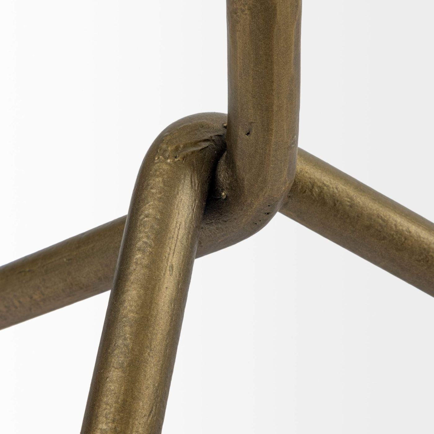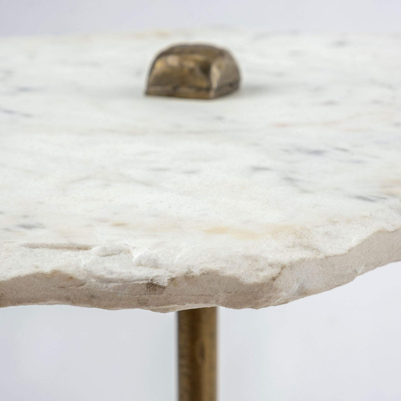 An accent table with a unique choice of material, a white, marble top with an all-natural edge. Finished in its natural color and character, the slab is sanded just enough to make sure the edges are safe, so it still maintains its natural, grainy character. The table's marble top is supported by an antique-gold polished, triangular iron frame which not only looks great but is also strong and stabilizes the table to perfection. A great choice of accent furniture in spaces based on the design styles.