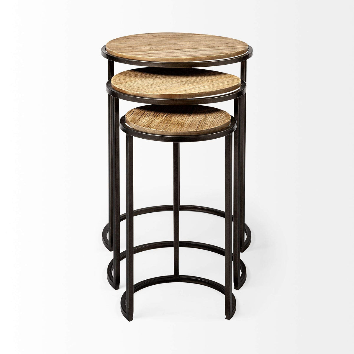 HomeRoots Black Metal Set of 3 Brown Wood Round Top Accent Tables with Iron Nesting
