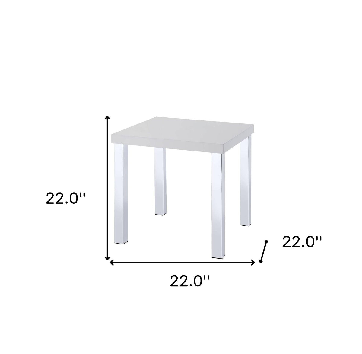 Show off your exquisite taste with this 22-inch high-gloss chrome and white square side table. The quality construction of the chrome metal base combines with high gloss white wood of the top to give this table a fresh and updated look. Sleek lines make this table stand out. Side tables are a great way to flank your sofa, use them as an accent next to your favorite chair, or they can even be used next to the nightstand. It can also be used as an entry table to hold your keys. 22"H x 22"W x 22"D
