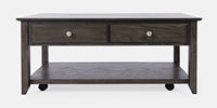 A smooth finish, dovetailed drawers and brushed nickel hardware make this Espresso Modern Four Drawer Coffee Table everyone's favorite. There is plenty of storage with the four full-size drawers and one shelf, and optional included caster wheels make moving a breeze. Available in Espresso Brown and Grey-Brown Carlton finishes.
