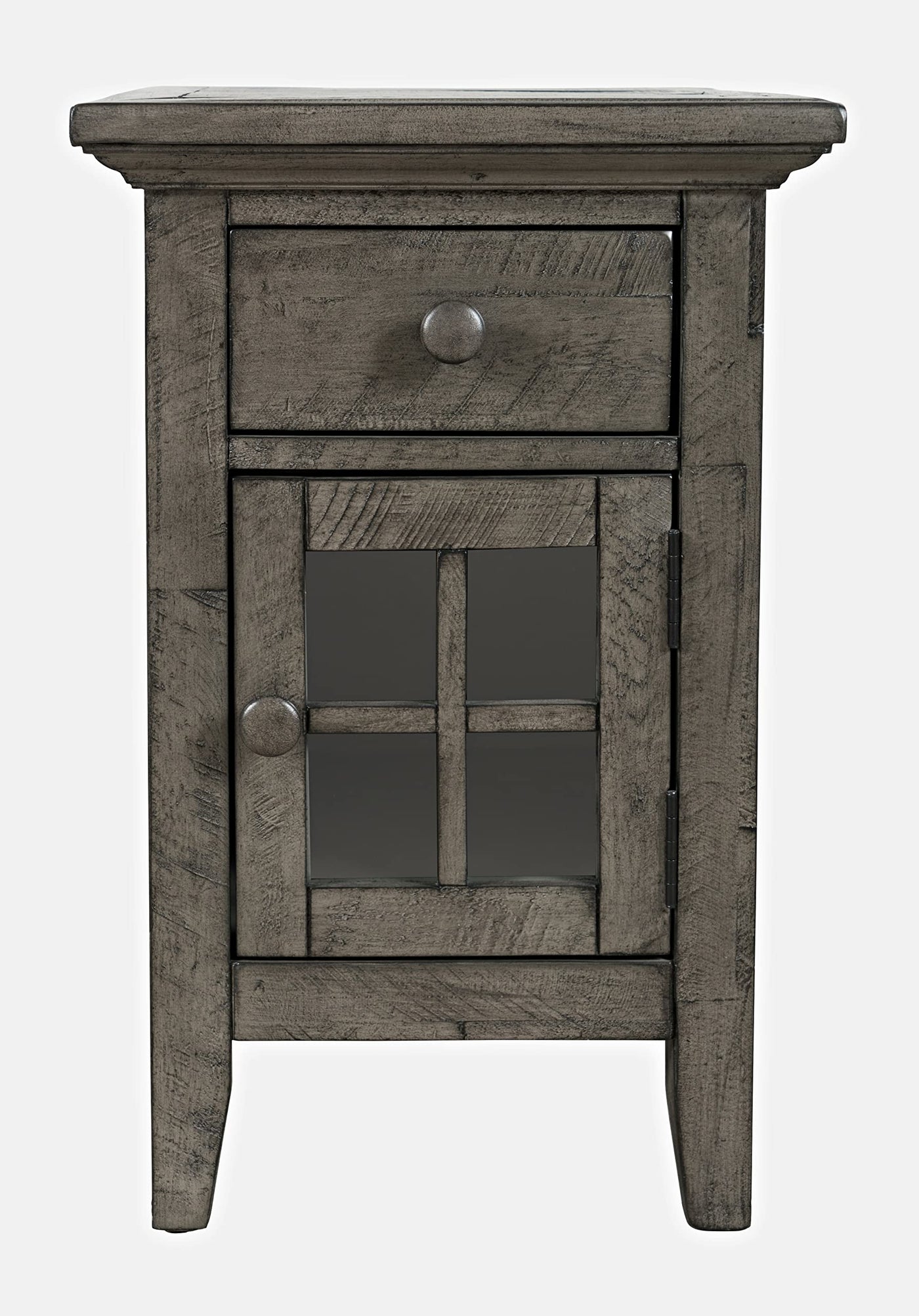 Our rustic Shores power accent tables are as useful as they are beautiful. These pieces look incredible with a naturally worn look and a Panel door, but it's the hidden charger and easy storage that makes them a real treasure. Charge your tablet and plug in a lamp without have a tangle of cords. Available in Scrimshaw, surfside, and weathered Grey finishes.