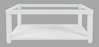 Contemporary style with a solid tempered glass inlay, this Urban Icon Rectangular Coffee Table features three unique color options and modern beveled edges. One full-length storage shelf is included, and the optional caster wheels make moving easy. Available In White, Black, and Merlot finishes.