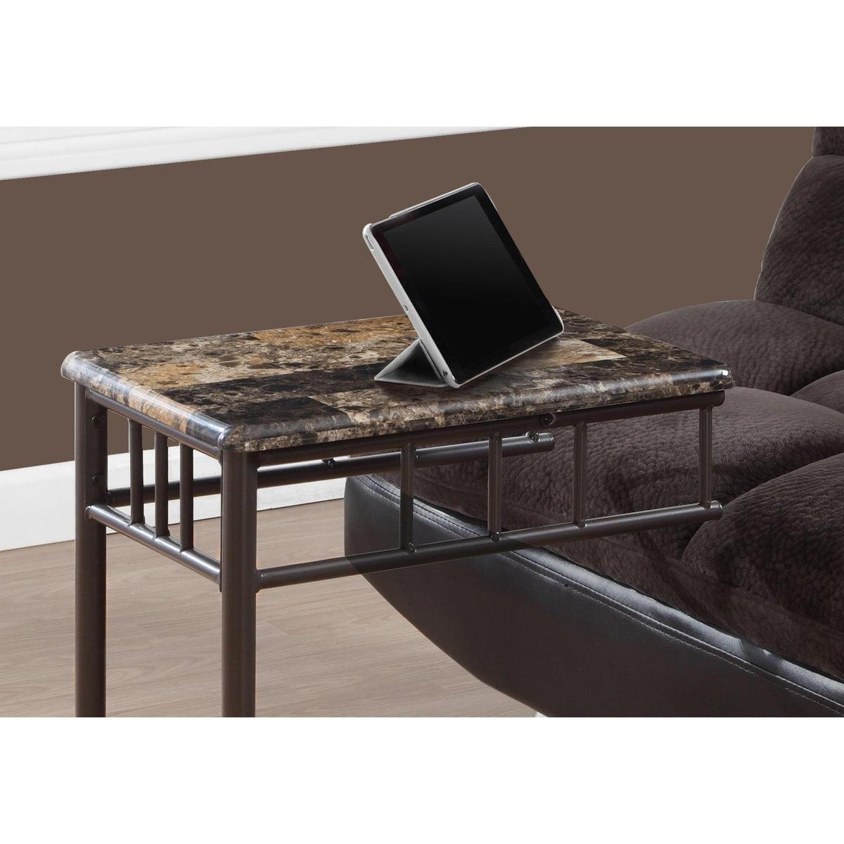 What A Convenient Way To Eat Or Drink On Your Couch! This Classic Rectangular Snack Table With An Espresso Marble-Look Top Has Sufficient Space To Place Your Tablet, Laptop, Snacks, Drinks And Even Meals. The Bronze Metal Base Provides Sturdy Support Along With An Elegant Touch And Is Designed To Easily Slip Under Your Sofa.