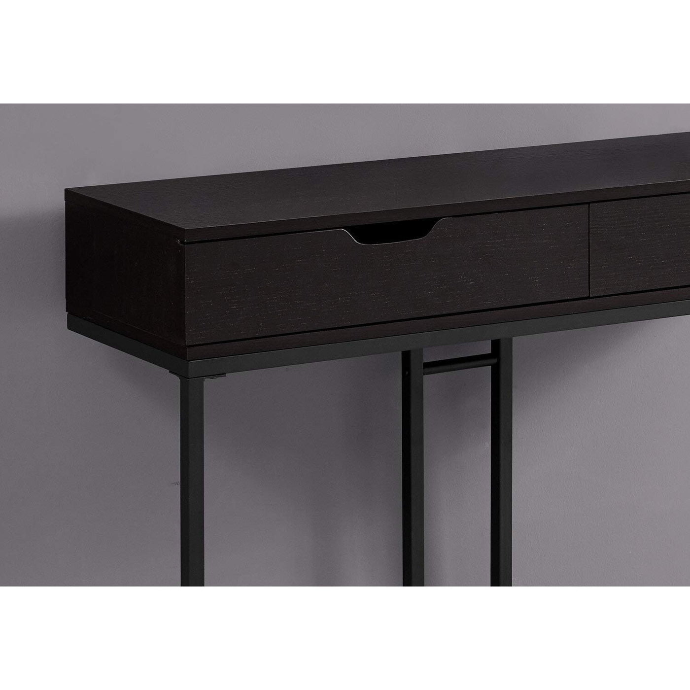 If maximum functionality with style is key, then this contemporary hall console table will hit all the right notes in your home. It starts with the simple but elegant rectangular table top made from durable MDF material, in a warm cappuccino finish that includes two spacious drawers with easy built-in grooved handles at the top to store magazines, papers, keys. This is boldly framed over an angular black metal base with a unique design. An accent table this versatile can easily move from an entryway, to a living room, bedroom, or office space to meet your needs. Assembly is required.