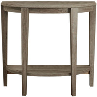 Add A Stylish Touch That Will Complete Your Living Space With This Sleek Hall Console Table Finished In A Dark Taupe Reclaimed Wood-Look. The Curved, Half-Moon Shape Is Complimented By The Chic Tapered Legs. Ample Surface Area And A Two-Tiered Design Make This Piece Perfect For Displaying Your Favorite Decorative Items Or Pictures.