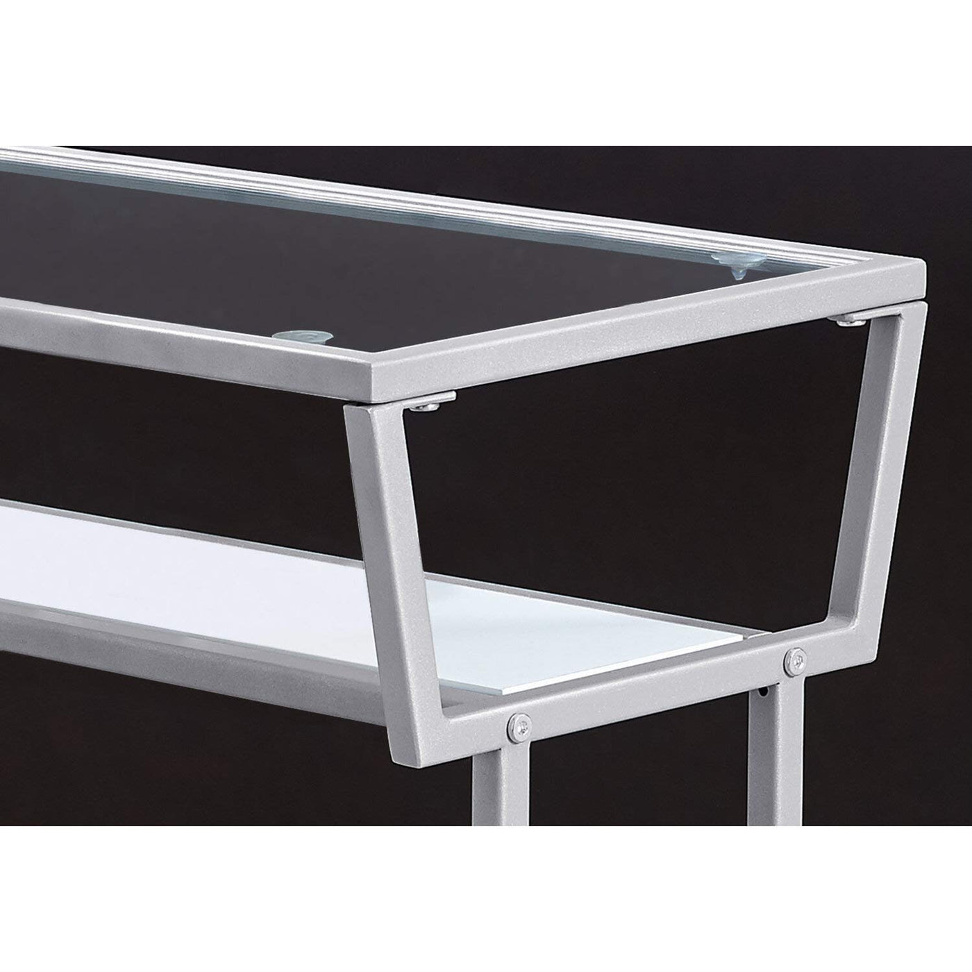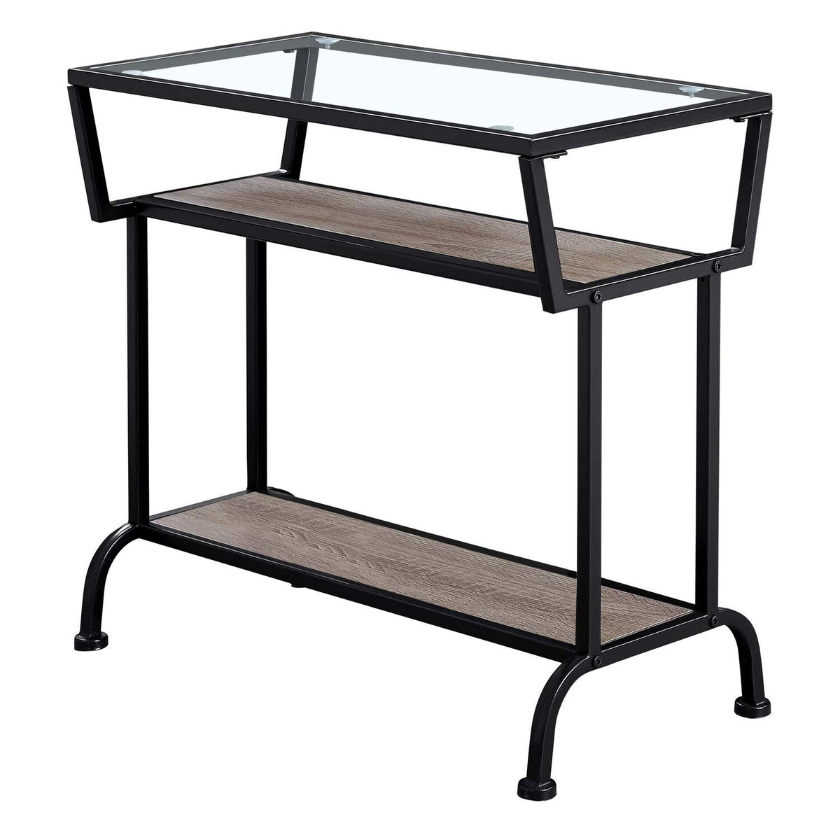 Giving both style and function without overwhelming your space, this contemporary side accent table gives an easy light and airy feel to a room. Framed in sturdy black metal with simple angular lines and finished with a graceful curve to the feet. Place a decorative object, plant or magazine on the tempered glass rectangular top for a welcoming appeal. The two open bottom shelves inserted with warm dark taupe MDF panels can easily hold a small stack of books or additional showpieces. Bring this end table into your livingroom, reading corner, family room, or even the bedroom as a place to store all your necessities within easy reach in an elegant design. Assembly is required.