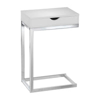 This beautiful glossy white finish rectangular accent table is a great addition to any living room, family room, or home office. With sufficient surface space for snacks, drinks, or tablet as well as a convenient storage drawer that slides out on either side for remotes, coasters and other accessories, this table is perfect for movie night, snacking in front of the tv or entertaining guests during the big game. The chromed metal base provides sturdy support along with a fashionable touch that will suit any decor.