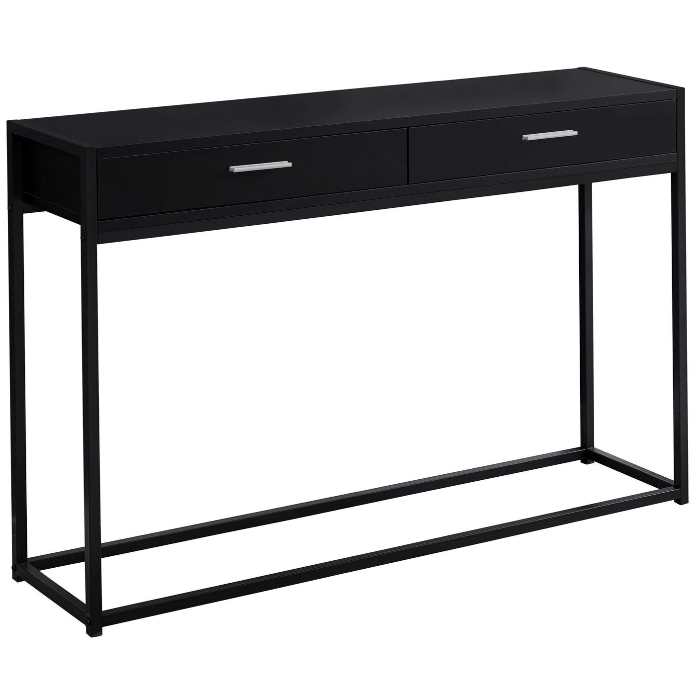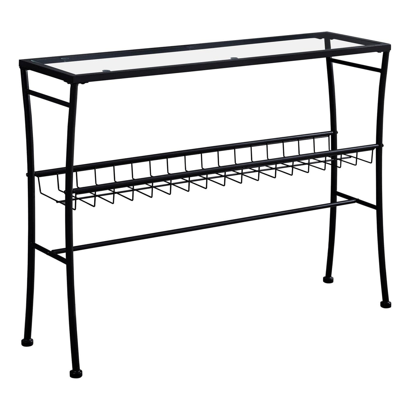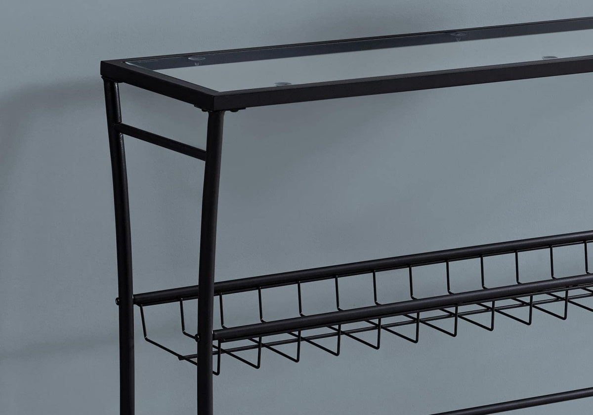 The simple, contemporary design of this versatile rectangular hall console table features a clear tempered glass table top to place a decorative accessory, lamp, or pictures and a handy wired metal bottom shelf to store books or wine bottles. Framed in a strong and sturdy black metal with attractive slightly concave legs, this console table can be used in an entryway, behind a sofa, in an office space setting, or even as a table to set up your drinks or hors-d'oeuvres when entertaining. The compact size makes it even more useful for small spaces. Easy to assemble, you will have a stylish accent console table and storage solution in no time at all!