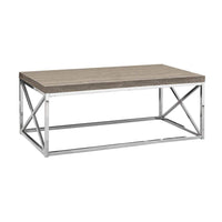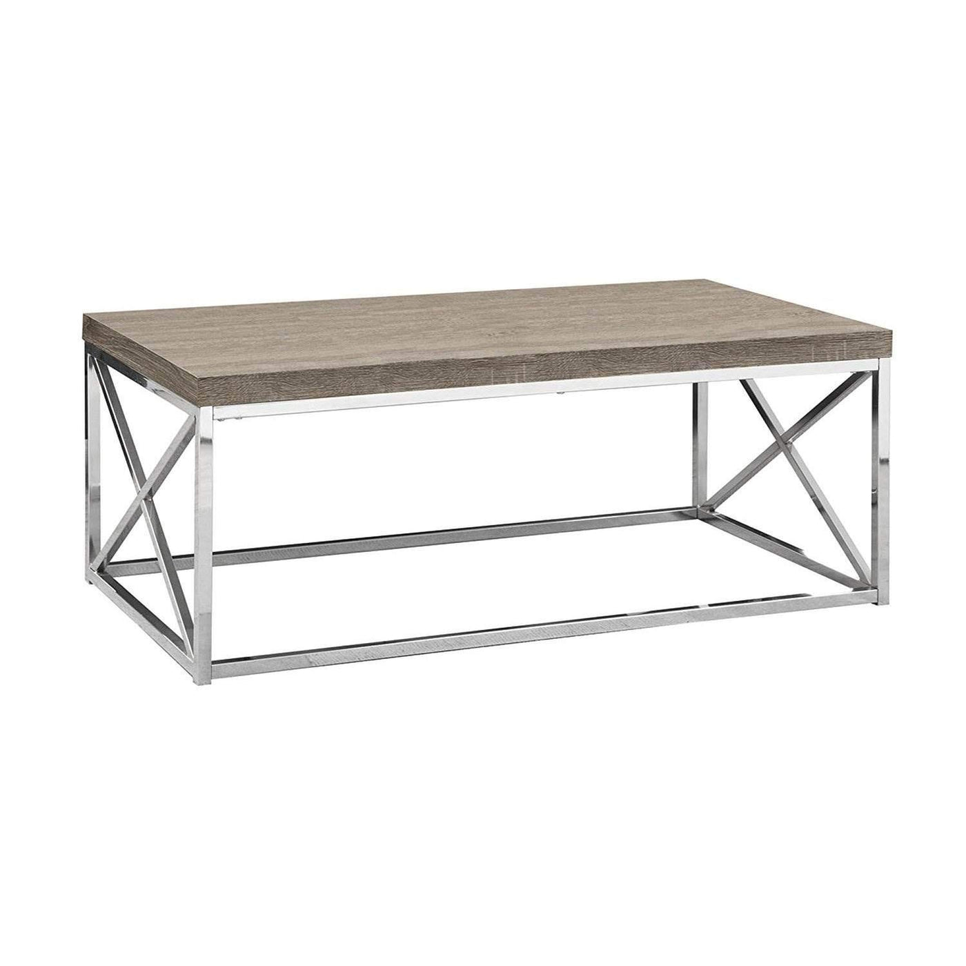 With a dark taupe wood-look top and a stylish, thick paneled design, this cocktail table gives an exceptional look to any room. The modern rectangular shape and criss-cross chrome metal base provide sturdy support as well as a contemporary look. Use this multi-functional table to compliment your living space.