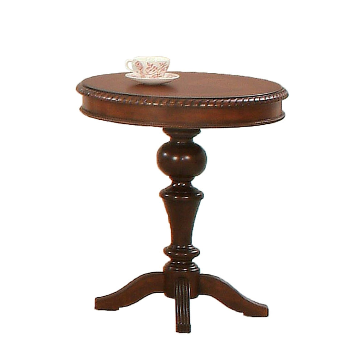 Graceful Elegance In A Traditional Design Statement Featuring Selected Hardwoods And Rich Cherry Veneers In A Warm, Medium Brown Finish. Solid Legs Are Intricately Turned For Substance And Visual Appeal And Finished In A Slightly Darker Tone. Intricate Carvings Accent The Top Borders And Aprons. This Unique 22" Round Chairside Table Features 24" Height For Ease Of Access Beside Chairs Or Sofas.