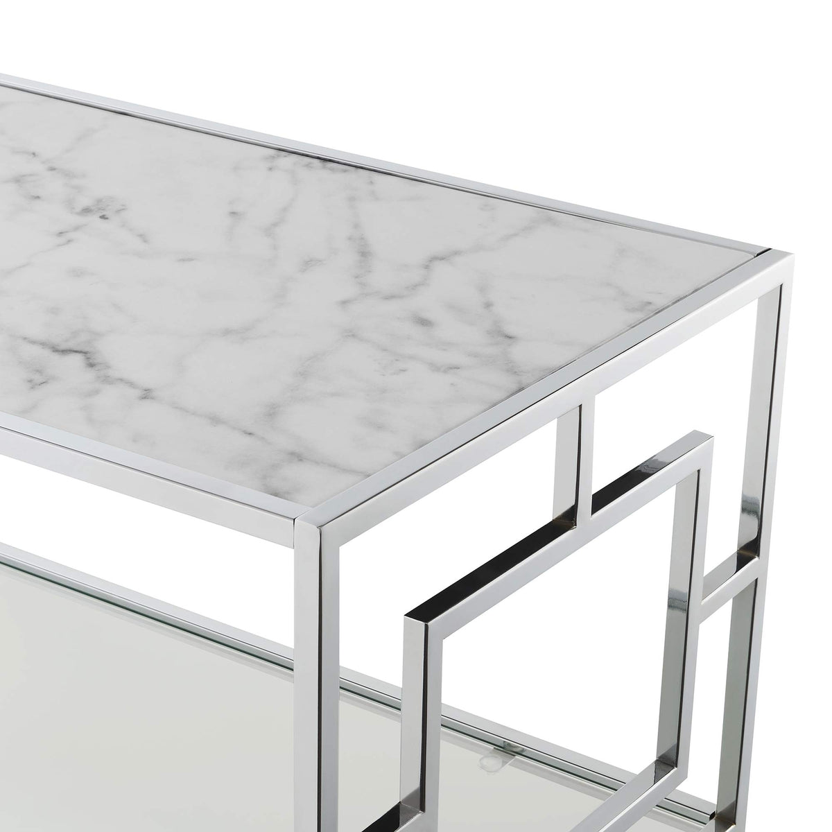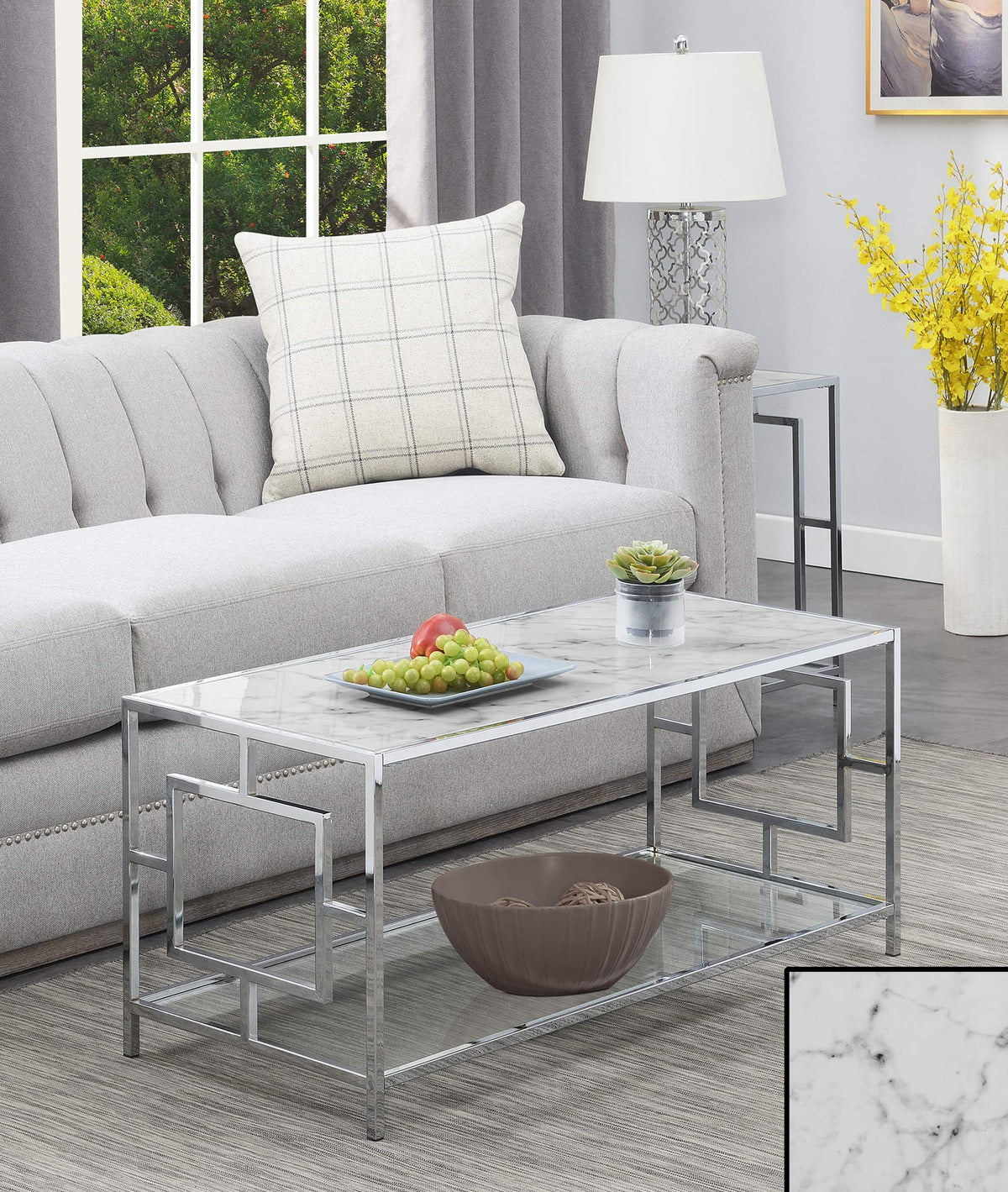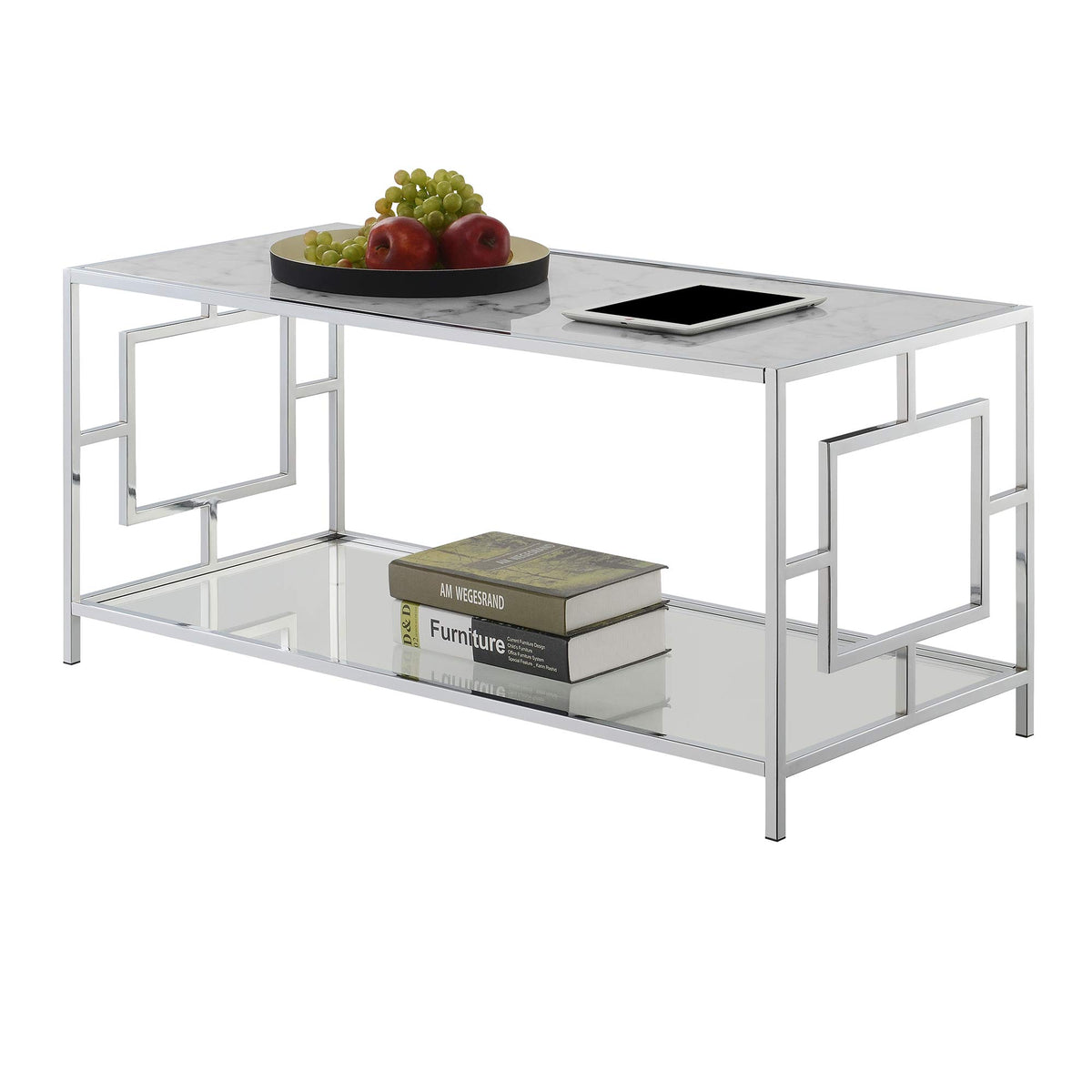 Town Square Chrome Coffee Table with Shelf, White Faux Marble/Chrome