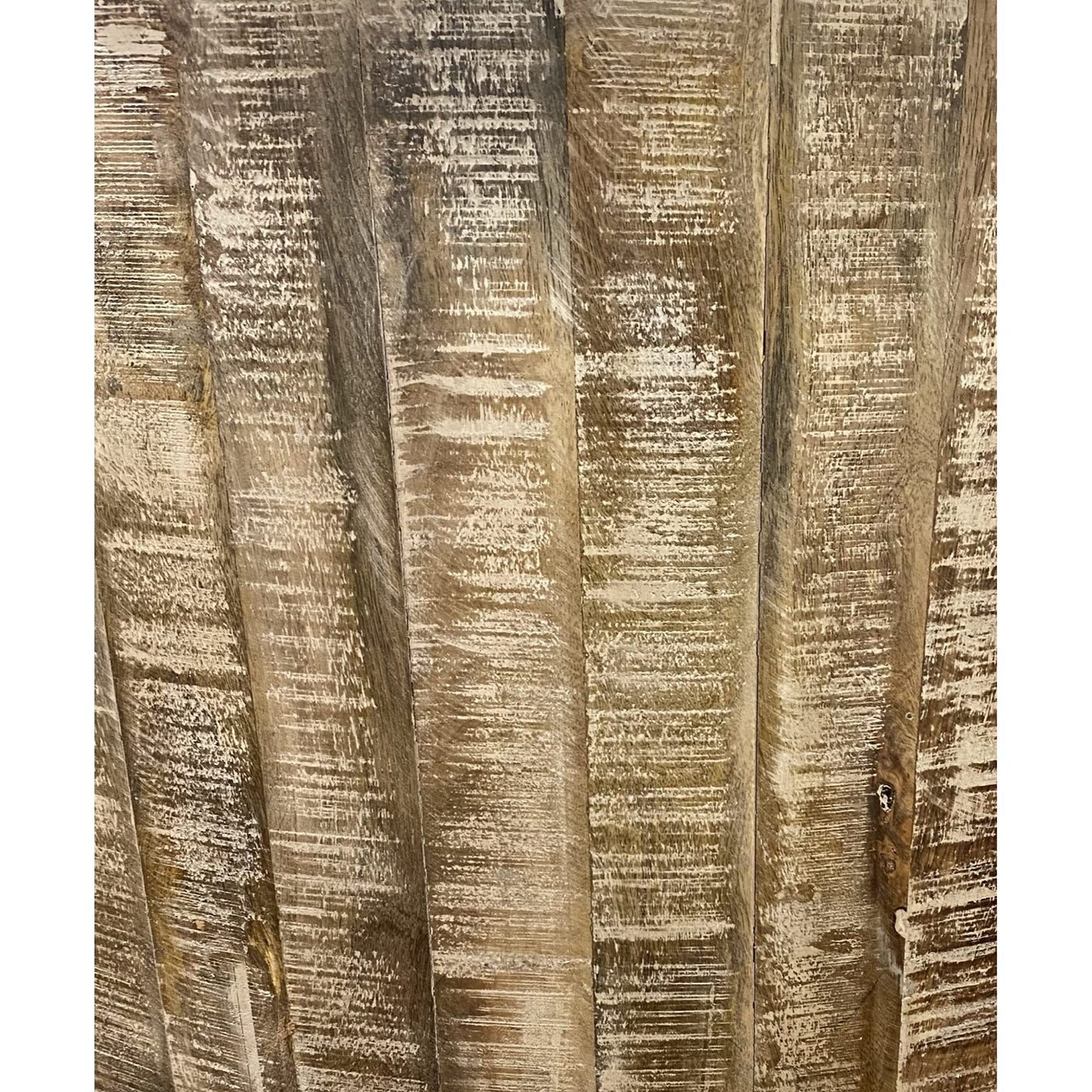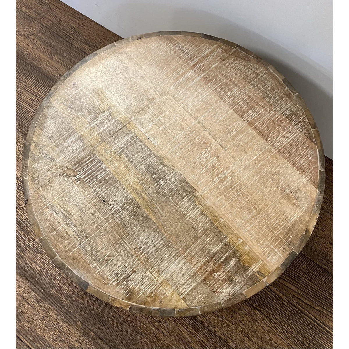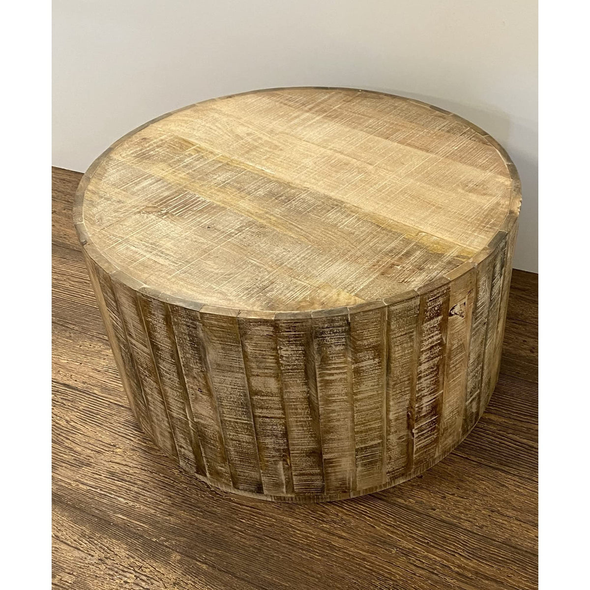 Unique in design, this updated rustic round coffee table brings the modern farmhouse to life. A great centerpiece for your living space, this round coffee table is made from striking drum-shaped mango wood that is cut into narrow planks. The rustic and heavily distressed finish gives this piece a great look and makes it casual and attractive for your room. . 18"H x 32.25"W x 32"D.
