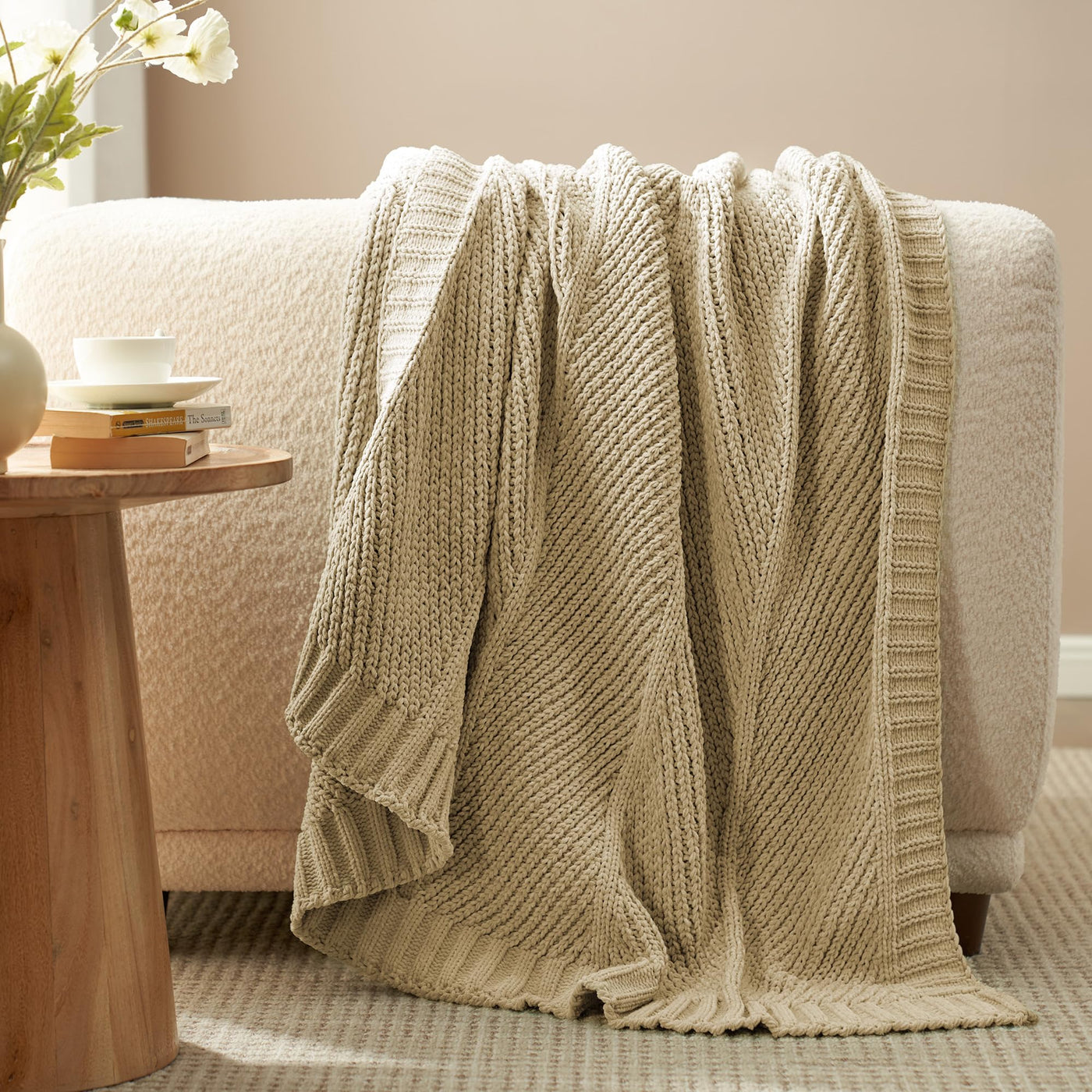 Am Lie Home Cable Knit Throw Blanket, Chenille Knitted Chunky Throw Non-Shedding Chevron Texture, Decorative Farmhouse Cozy Bla