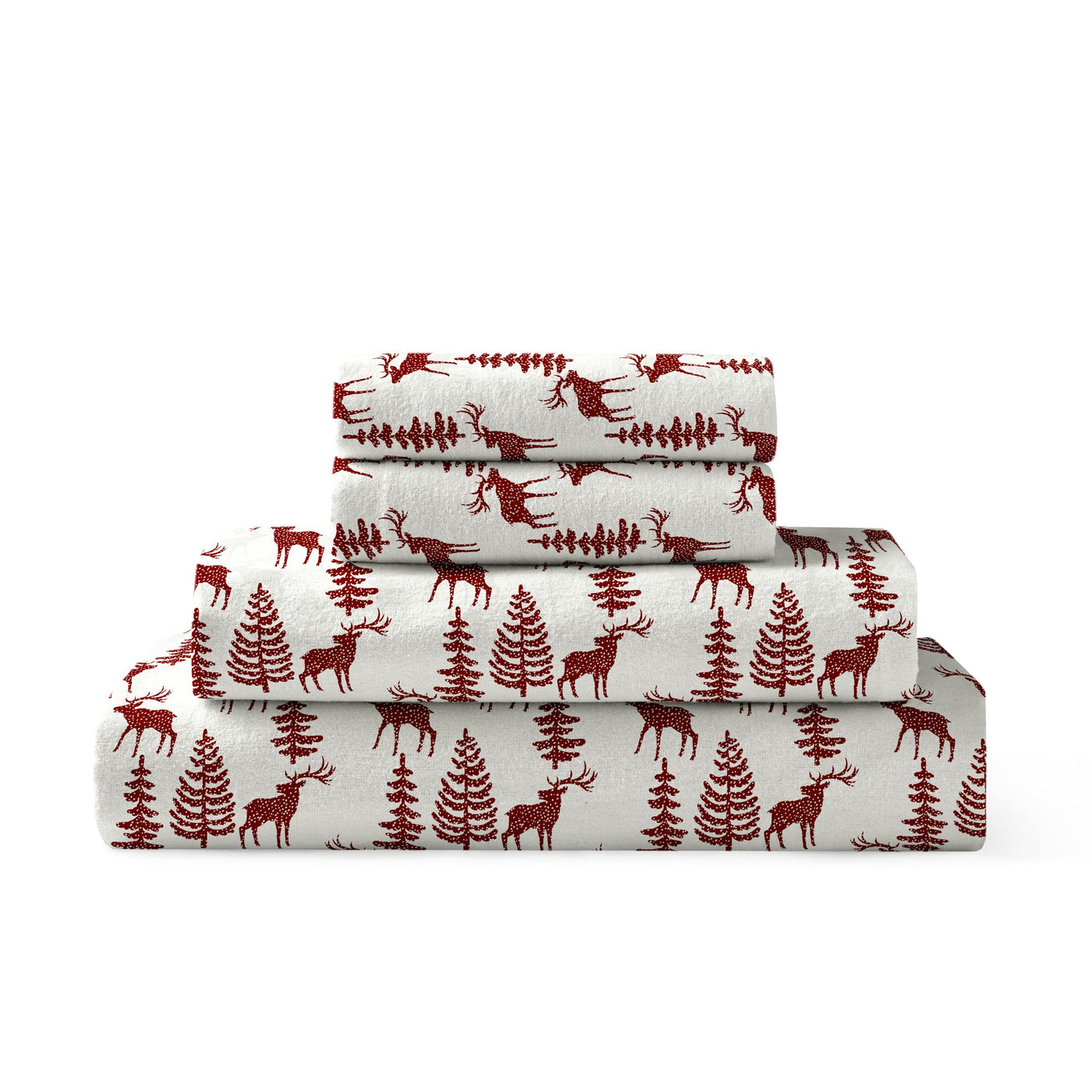 Brielle Home Flannel Sheet Set Cotton Soft Warm & Cozy Modern Chic With Elastic Deep Pockets, Full, Deers Red