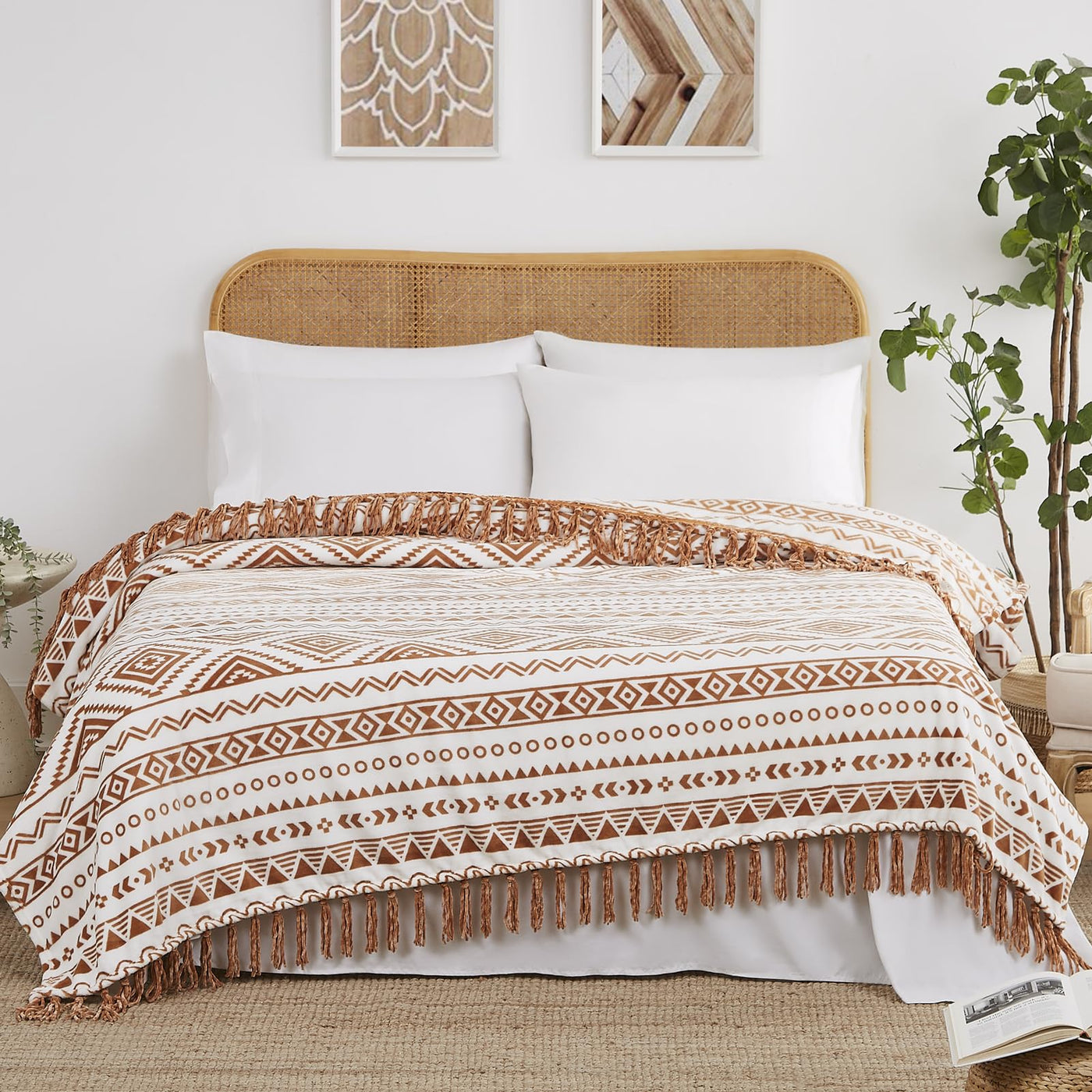 Casaagusto Queen Boho Blanket, Terrcotta Aztec Blankets With Tassel - Printed Flannel Cozy Soft Western Blanket For Chair, Bed,