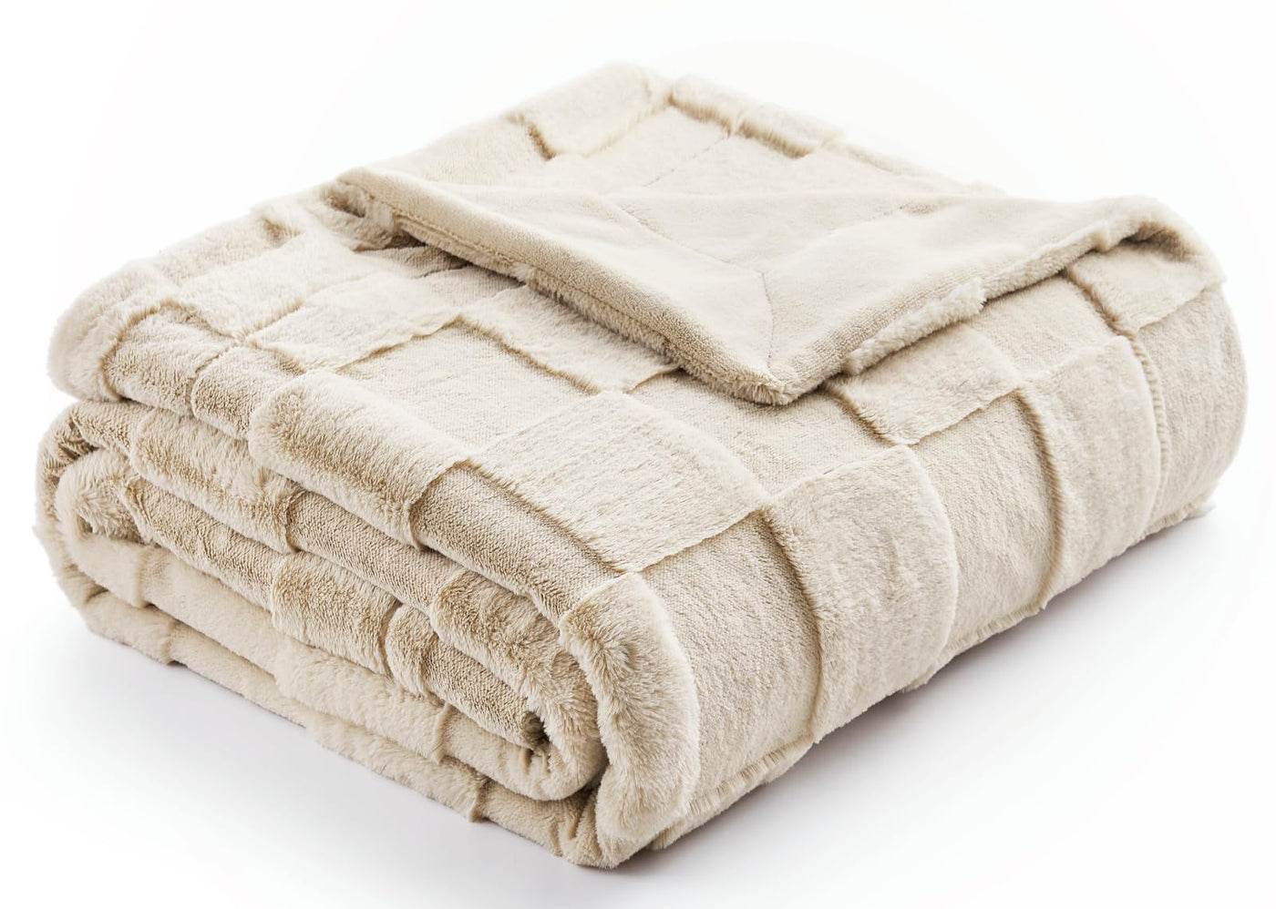 Cozy Bliss Tan Checkered Faux Rabbit Fur Throw Blanket, Lightweight Fleece Soft Fuzzy Fluffy Minky Furry Blankets For Couch, Bed