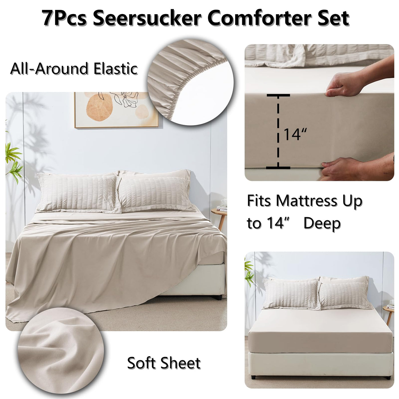 Cozylux Queen Seersucker Comforter Set With Sheets Beige Bed In A Bag 7-Pieces All Season Bedding Sets With Comforter, Pillow Sham, Flat Sheet, Fitted Sheet, Pillowcase
