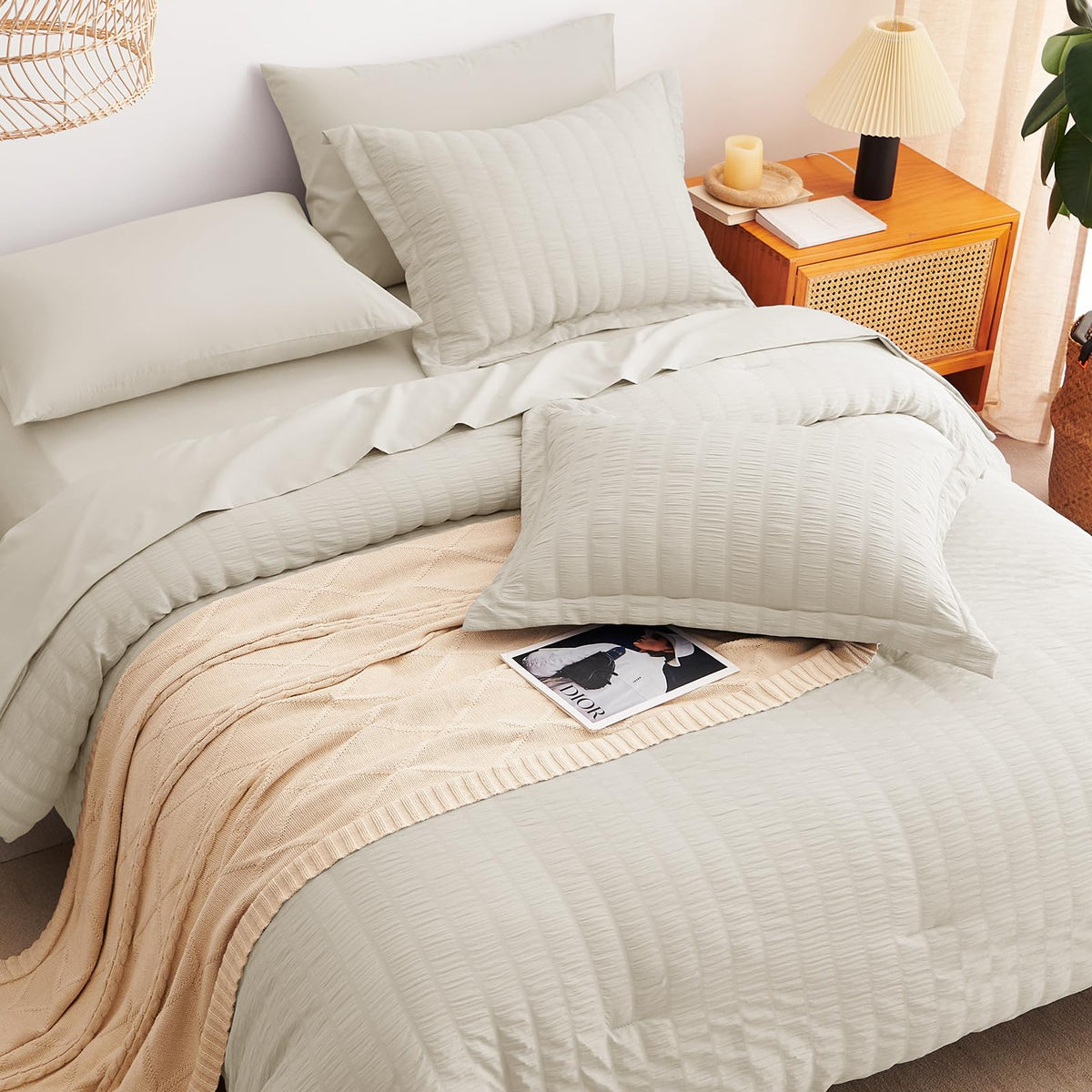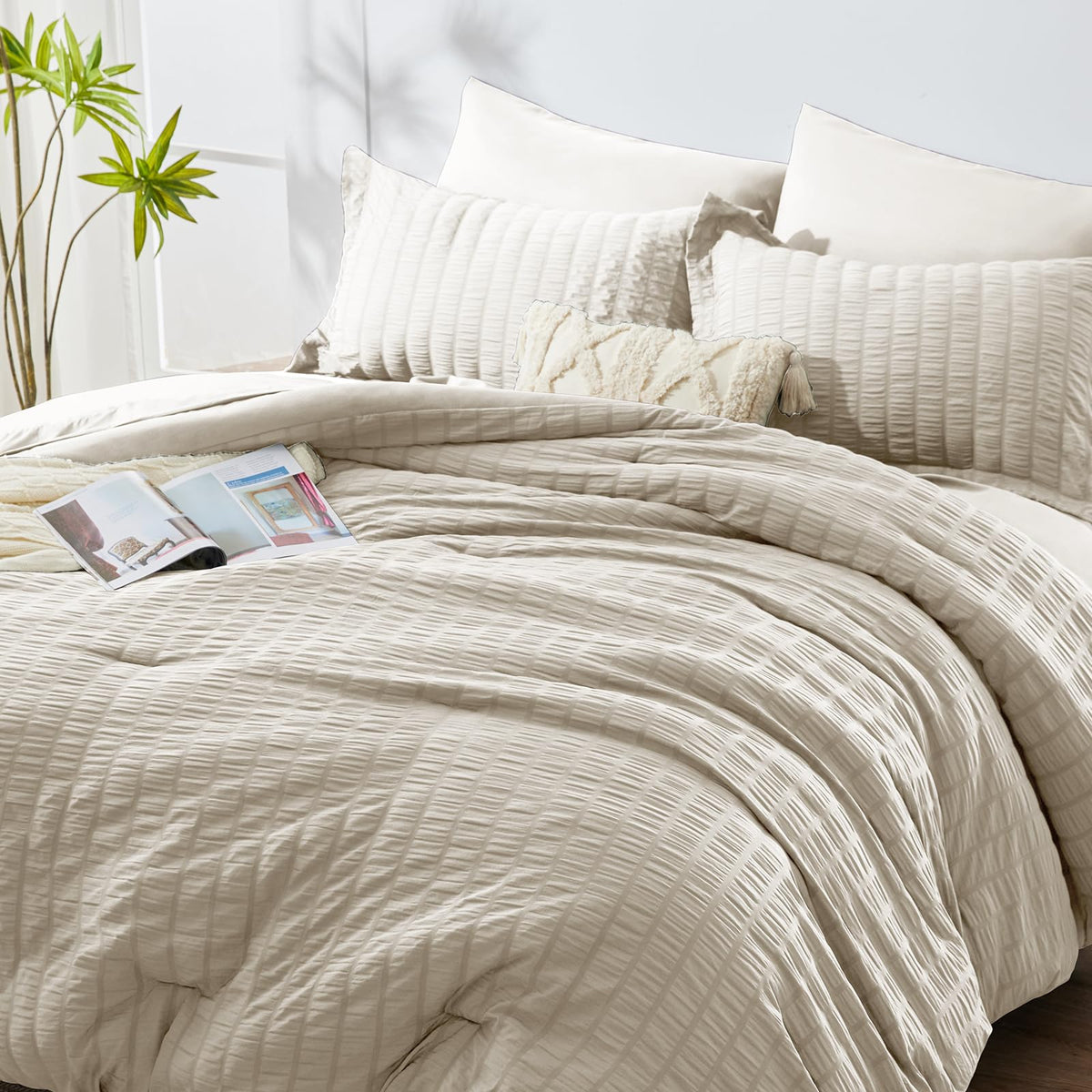 Cozylux Queen Seersucker Comforter Set With Sheets Oatmeal Bed In A Bag 7-Pieces All Season Bedding Sets With Comforter, Pillow Sham, Flat Sheet, Fitted Sheet, Pillowcase