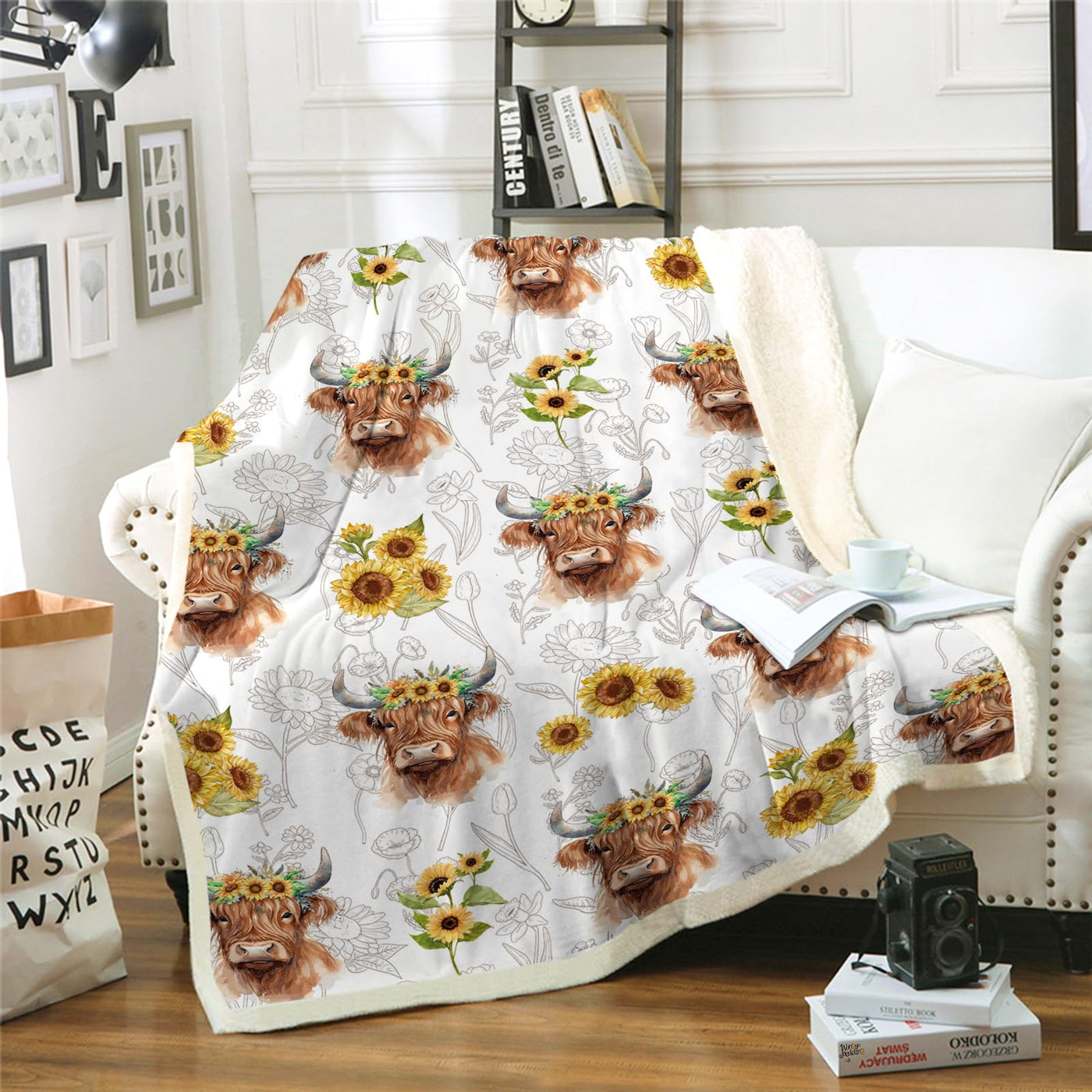 Highland Cow Blanket Reversible Sherpa Throw Blanket Sunflower Highland Cow Gifts For Women Girls Adults Cow Lovers, Warm Cozy Plush Fleece Blanket For Bed Sofa Couch 60'X80'