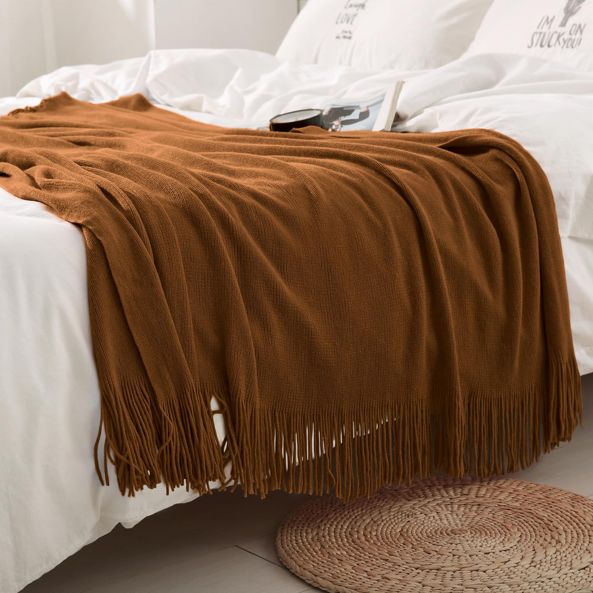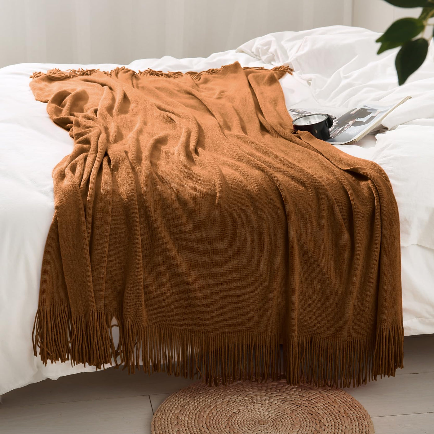 Homiest Decorative Knitted Throw Blanket With Fringe, Lightweight Blanket Acrylic Knit Blanket, Soft & Cozy Tassel Blanket For Couch Sofa Bed (Light Brown, 50 X 60 Inch)