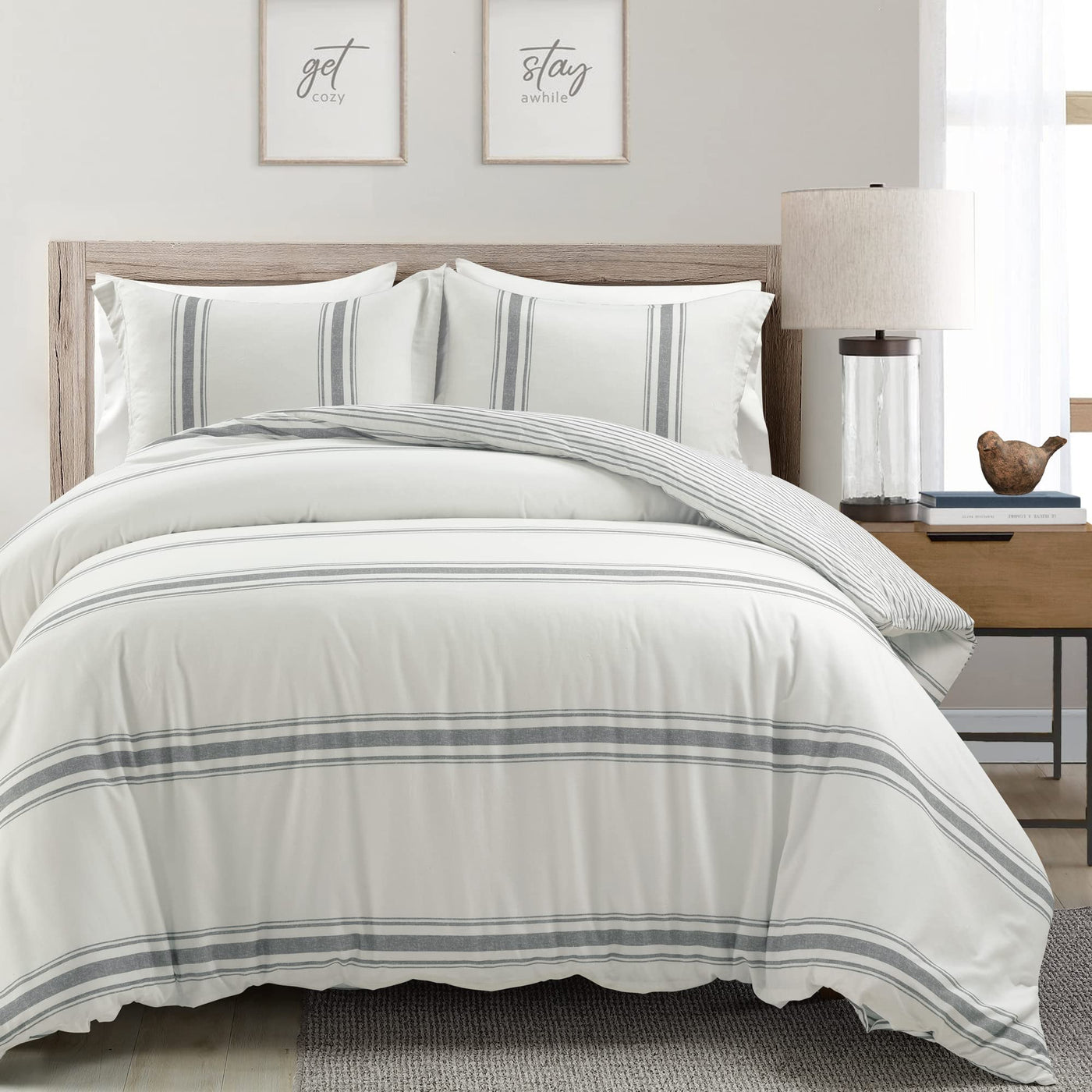 Decorate Your Primary Bedroom Or Guest Bedroom With The Traditional Farmhouse Style Of Our Farmhouse Stripe Reversible Cotton Duvet Cover Set. The Printing On The Front Of This Set Is Reminiscent Of Shiplap Beams, With A Pattern Of Thin And Thick Colored Stripes On A Cream Background. This Charming Rustic Style Duvet Cover Set Is Reversible, Giving You Two Stylish Looks In One Great Set! The Reverse Of Both The Duvet Cover And Shams Features A Pinstripe Pattern In The Same Colors. Either Look Is Great For All Ages. This 3 Piece Set Includes 1 Reversible Duvet Cover And 2 Matching Pillow Shams. This Is A Look We Are Sure Modern Farmhouse Fans Will Love, But It Can Also Work Is Many Home Decor Styles Such As Traditional, Coastal, Or Country Cottage. This Farmhouse Style Duvet Cover Set Is Made Of 100% Cotton Fabric And Is Very Soft To The Touch. The Weight Will Depend On The Fill You Choose. Add Your Favorite Insert Weight Or Change It Seasonally For Year-Round Comfort Tailored Just For You. Easily Secure Your Duvet Cover With The Button Closures And Use The Four Internal Corner Ties To Keep Your Comforter In Place. Designed For Effortless Maintenance, It'S Easy To Care For This Bedding Set. Simply Machine Wash Cold On The Gentle Cycle And Tumble Dry Low. If Needed, Use Non-Chlorine Bleach For Cleaning Or An Iron On Low Heat To Release Wrinkles. Please Refer To The Product Labels For Full Care Instructions.
