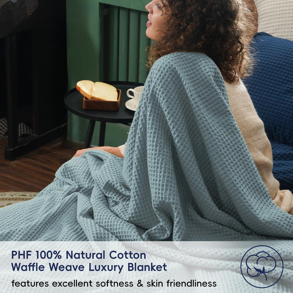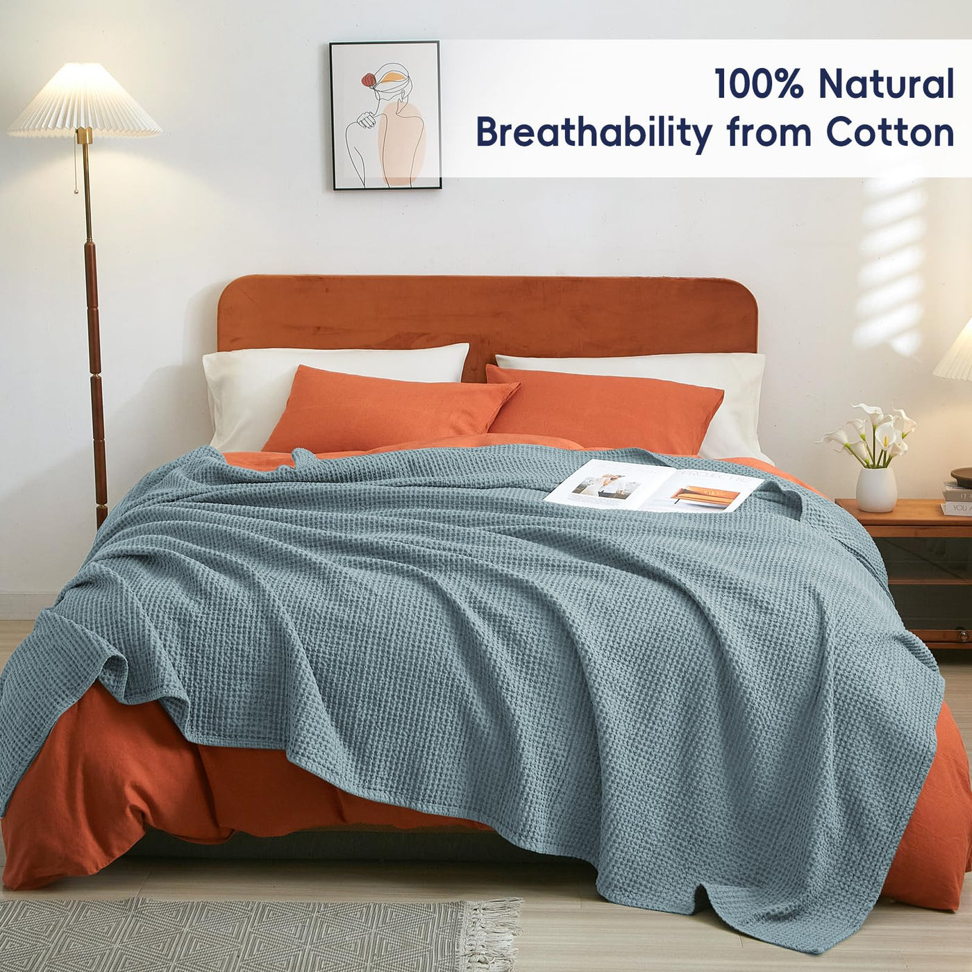 PHF 100% Cotton Waffle Weave Blanket King Size 104' x 90' - Lightweight Cozy Washed Soft Breathable Throw Blanket - Perfect Blanket Layer for Couch Bed Sofa - Elegant Aesthetic Home Decoration - Ocean