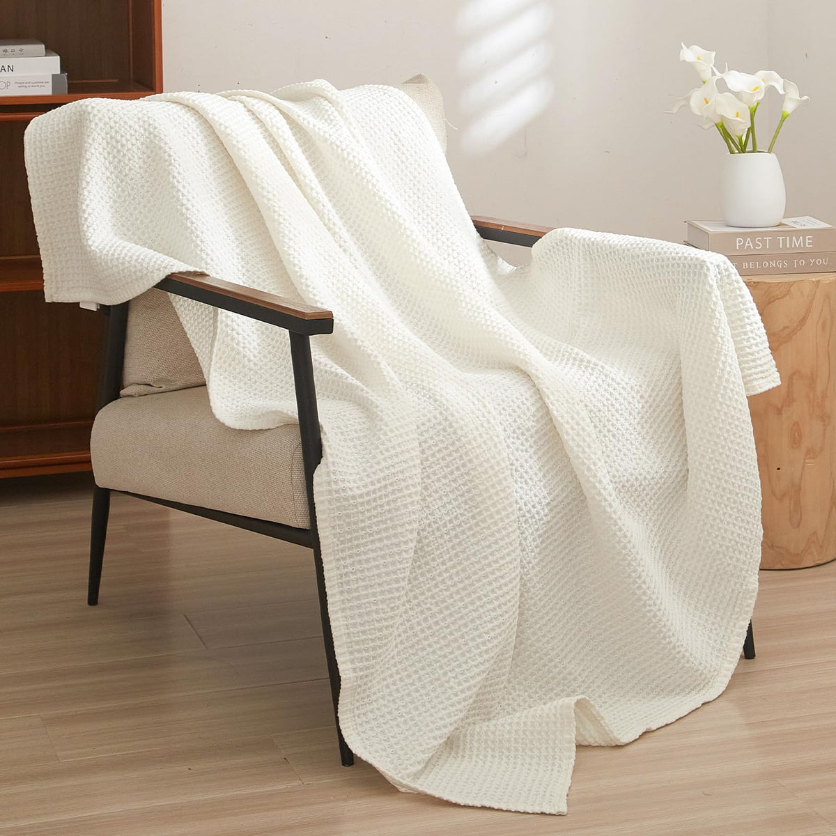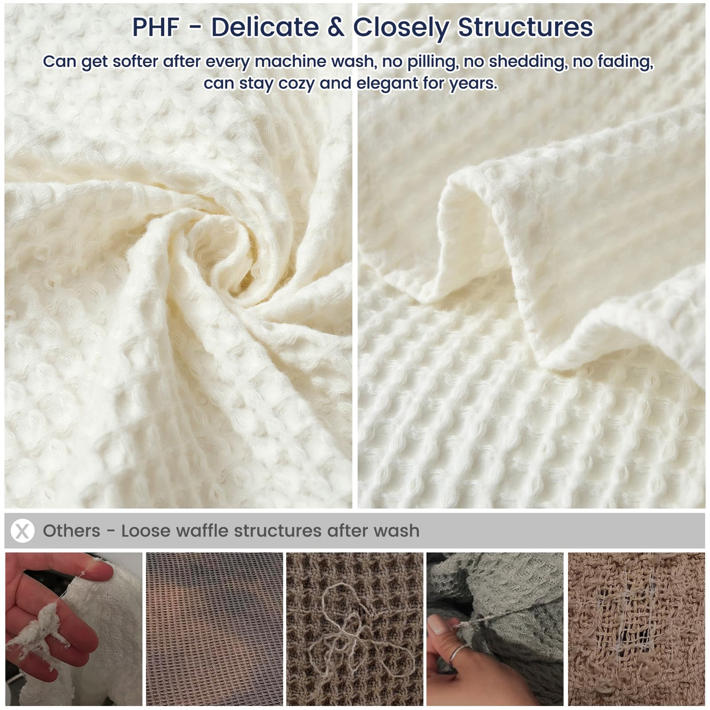 PHF 100% Cotton Waffle Weave Throw Blanket 50' x 60' - Lightweight Cozy Washed Soft Breathable Throw Blanket - Great Blanket Layer for Couch Bed Sofa - Elegant Aesthetic Home Decoration- Cream