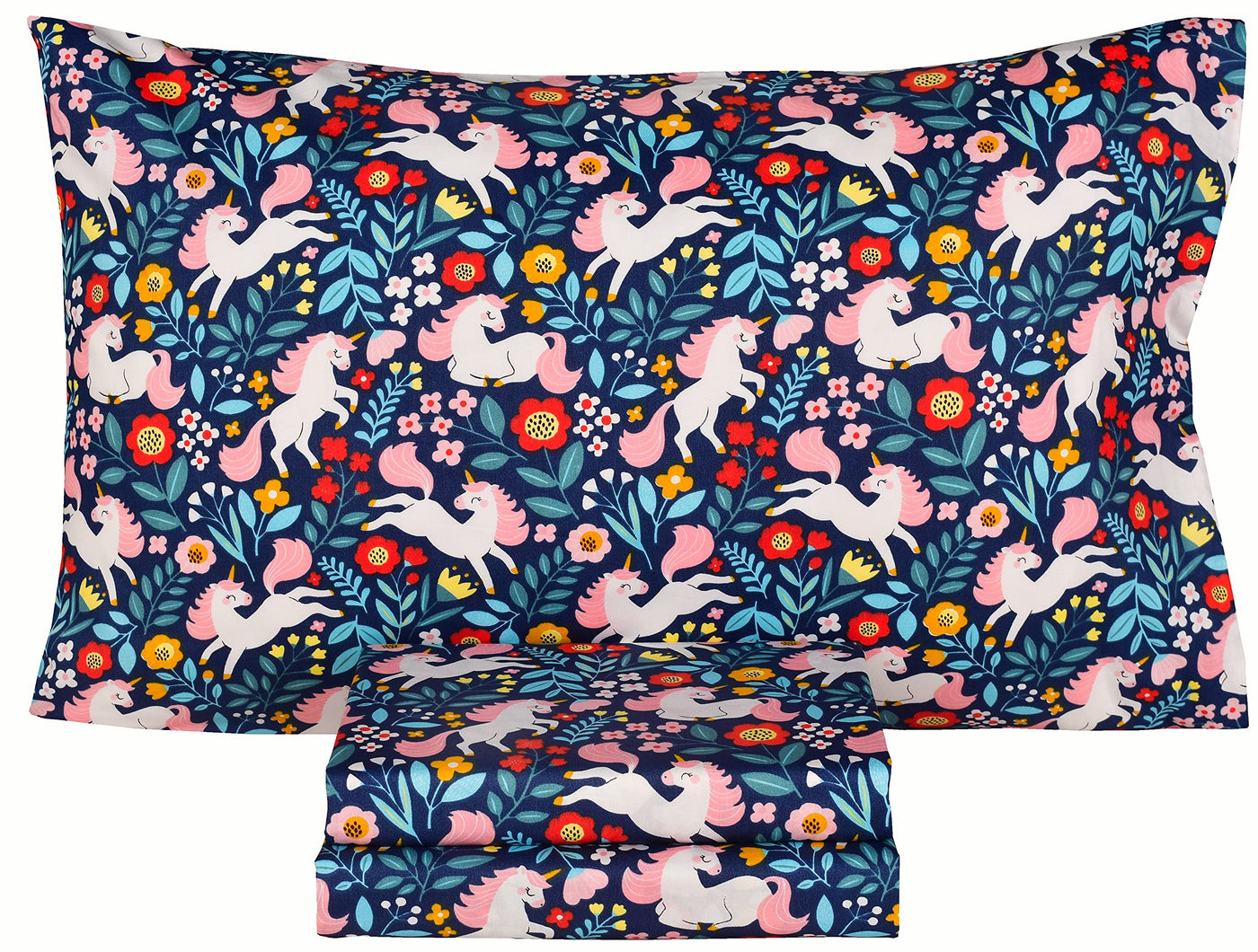 Scientific Sleep Unicorn & Flower Cute Fun 100% Cotton Cozy Twin Bed Sheet Set, Flat Sheet & Fitted Sheet & Pillowcase Natural B