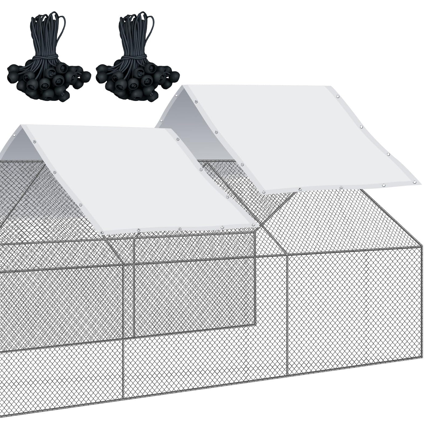 Features: Complete Accessories Kit: Each Package Comes With 2 Chicken Run Accessories And 50 Pieces Of 5.12 Inches Ball Bungees Cords. These Cords Aid In Installation And Securing The Cover, Making Them Practical And Convenient Chicken Run Accessories For Your Backyard Coop. Efficient Protection: Built From Sturdy Pe Material, This Outdoor Chicken Run Cover Provides Maximum Protection Against Adverse Weather Conditions, Such As Intense Sunlight And Rain. As Such, Your Chickens And Other Small Animals Can Enjoy A Comfortable And Secure Living Environment Regardless Of The Weather. Specifications: Main Material: Pecolor: Chicken Coop Cover: Whiteball Bungees Cord: Blacksize: Chicken Coop Cover: Approx. 11.5 X 6.6 Ftball Bungees Cord: Approx. 5.12 Inchespackage Includes: 2 X Chicken Coop Covers50 X Ball Bungees Cordsnotes: Manual Measurement, Please Allow Slight Errors On Size. The Color May Exist A Slight Difference Due To Different Screen Displays. Cover Only, No Cage Included.