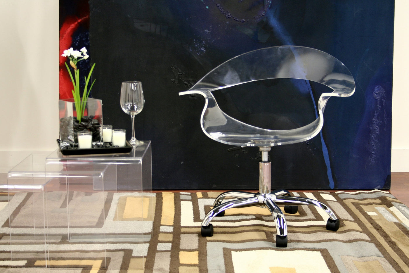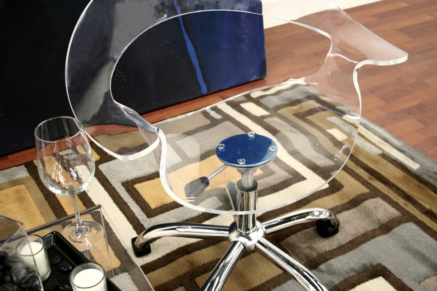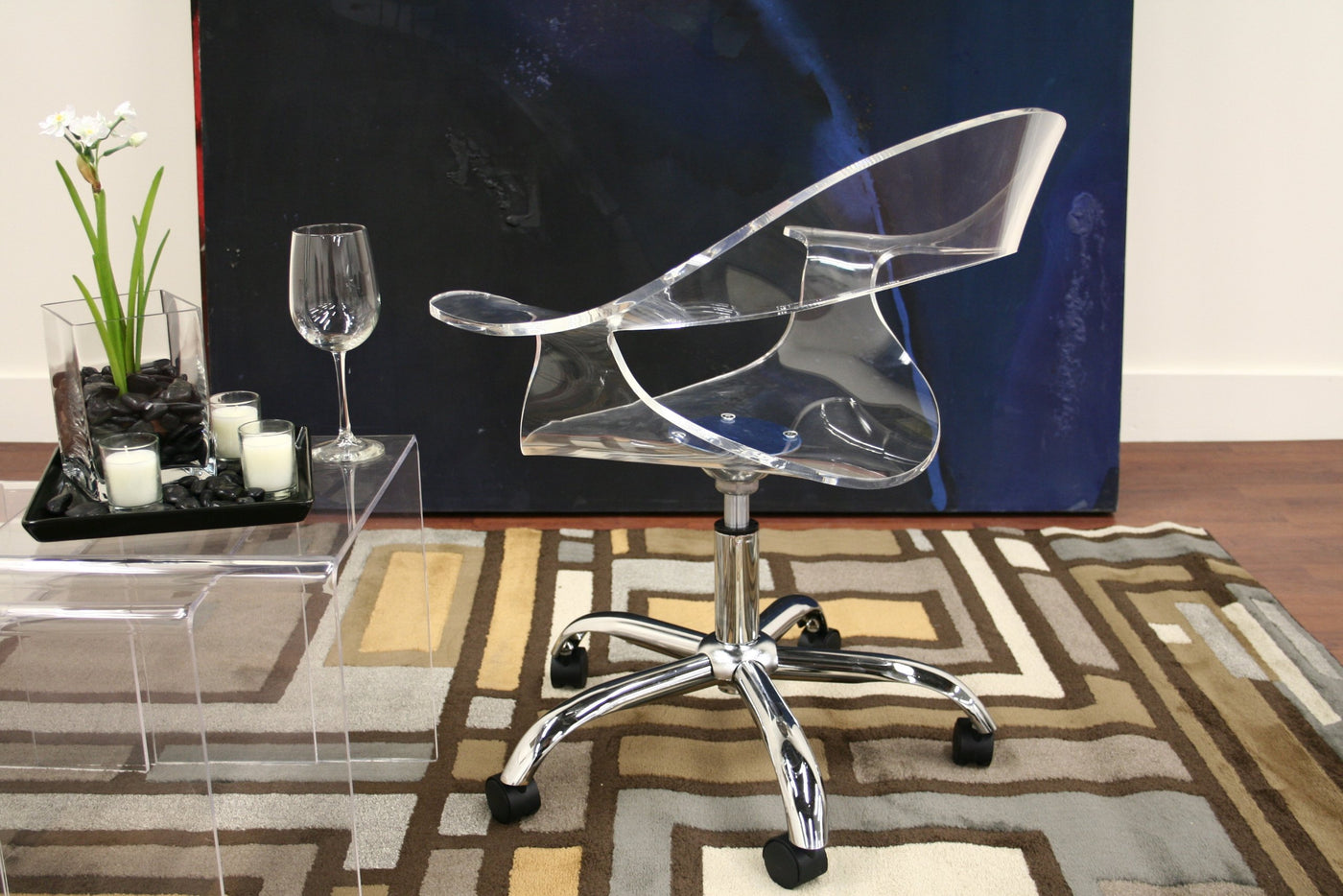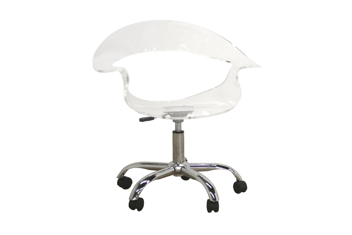 For those looking for an ultra-modern office chair, this design will not disappoint. Starring features include a transparent acrylic seat, 360 degree swivel, and adjustable height. The 5-wheeled base is constructed from steel with a high-shine chrome finish. This chair is sold as a one, and assembly is required. Chair measures 28 inches wide x 23 inches deep x 29.5 inches high. Seat height is 15.25 inches and depth is 16 inches. Arm height is 23 inches.