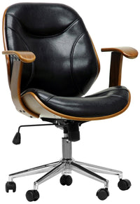 Getting down to business is a delight with the tailored look of our Rathburn Designer Office Chair. Made in China with a contemporary blend of walnut effect plywood and black faux leather, the Rathburn Chair features a paneled seat and foam cushioning for optimum comfort. Also included are the oft-desired 360 degree swivel and height adjustment features you have come to expect in a task chair. Finishing off this modern office chair is a chrome-plated steel base with plastic caster wheels. The Rathburn Office Chair requires assembly and should be wiped clean with a damp cloth. 24.37'W x 26'D x 36'H, seat dimension: 19.62'W x 18'D x 19.12-21.75'H, arm height: 27.62'.