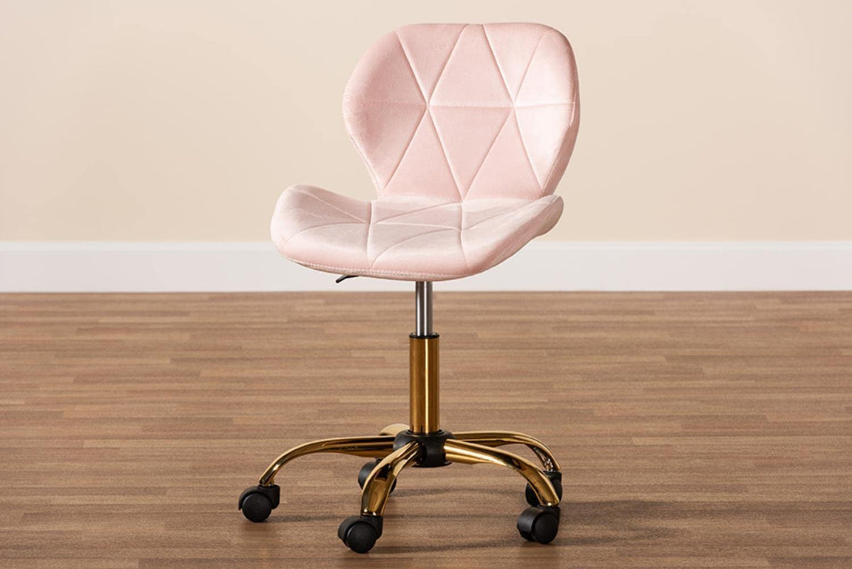 Embrace working from home with the wonderfully cozy and versatile Savara office chair. Made in China, this gorgeous piece is comprised of a solid metal base topped with an alluring velvet fabric upholstered seat. Geometric tufting on the chair exhibits a crisp, modern display while highlighting the rich hues of the velvet. The Savara requires assembly and features caster wheels for excellent mobility. 360-Degree swivel capability and adjustable height offer superb accommodation for individual needs, making the Savara chair an impressive addition to any home office.FeaturesContemporary glam and luxe office chairConstructed from Chrome and Plywood360-degree swivel capabilityAdjustable heightCaster wheelsUpholstered in velvet fabric and padded with foamCare Instruction: Spot CleanStyle : GlamourIncludes: One (1) Office ChairMaterial: Fabric Velvet, Polyester, Plywood, Metal , Chrome, Plastic, FoamColor: Blush Pink, GoldOverall Dimensions: 18.90" W x 14.60" D x 29.10"-33.90" H (adjustable)Seating Area Dimensions: 18.90" W x 14.60" D x 17.70" -22.40" H(adjustable)Back: 13.00" HLegs: 14.60" H;Assembly Required: YesMade In ChinaWarning: This product can expose you to chemicals including Formaldehyde which is known to the State of California to cause cancer.