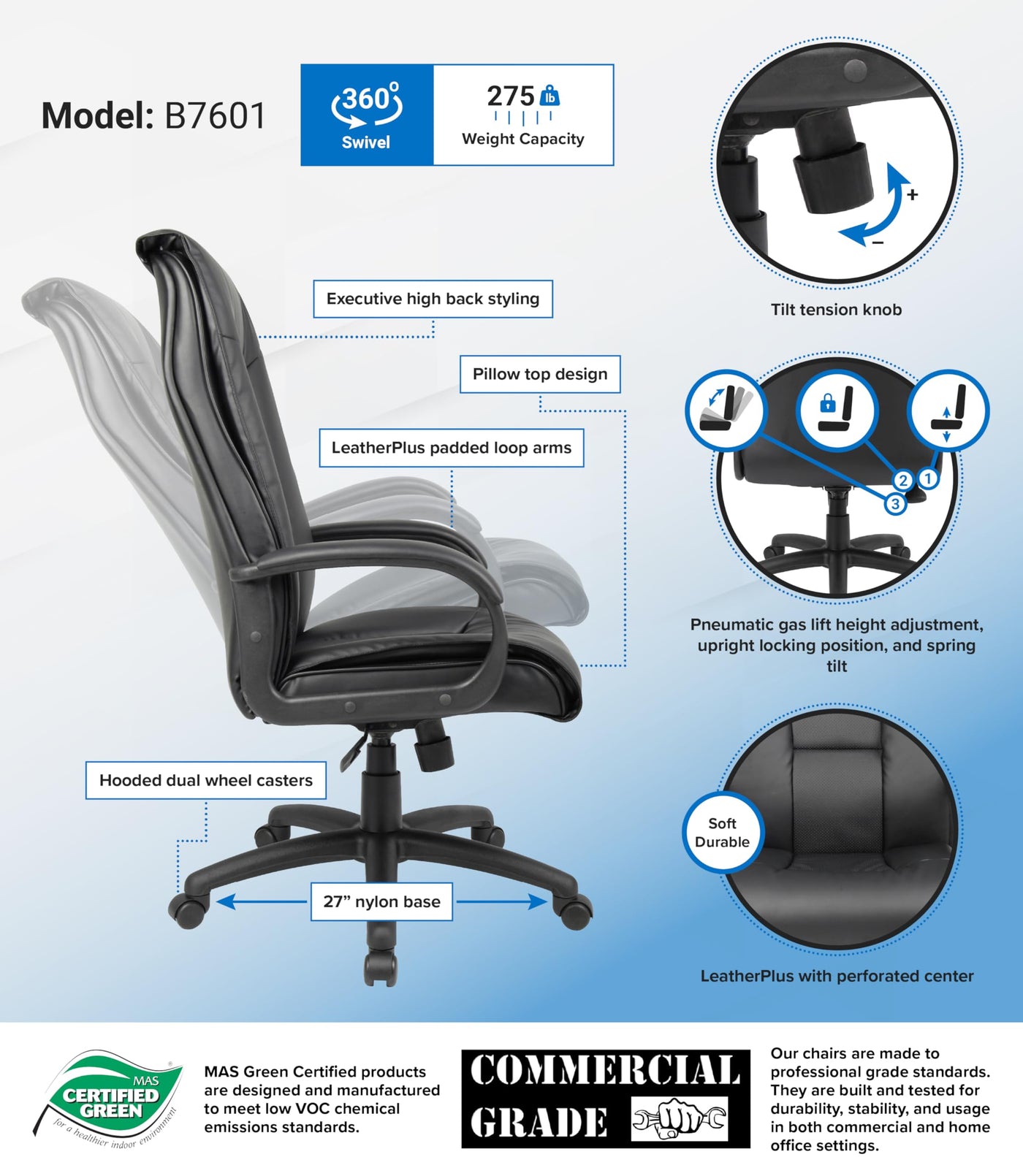 The Boss B7601 Executive Chair Combines Classic Style With A Hardwearing And Luxurious Finish Suitable For Home And Business Use. The Upholstery Is Black Leatherplus, A Polyurethane Infused Leather That Is Extra Soft And Durable, And The Pillow Top Design And Padded Armrests With Caressoft Upholstery Provide Additional Comfort For Extended Use. The Chair Is Generously Proportioned At 27.5"W X 28"D X 45-48.5"H, With A Weight Capacity Of 250 Pounds And A 27" Nylon Base For Stability. A Pneumatic Gas Lift Seat Adjustment And Tilt Tension Control Ensure The Most Comfortable Seating Position Possible, And The Hooded Double Wheel Casters Make It Easy To Move The Chair Around As Necessary. Assembly Required.