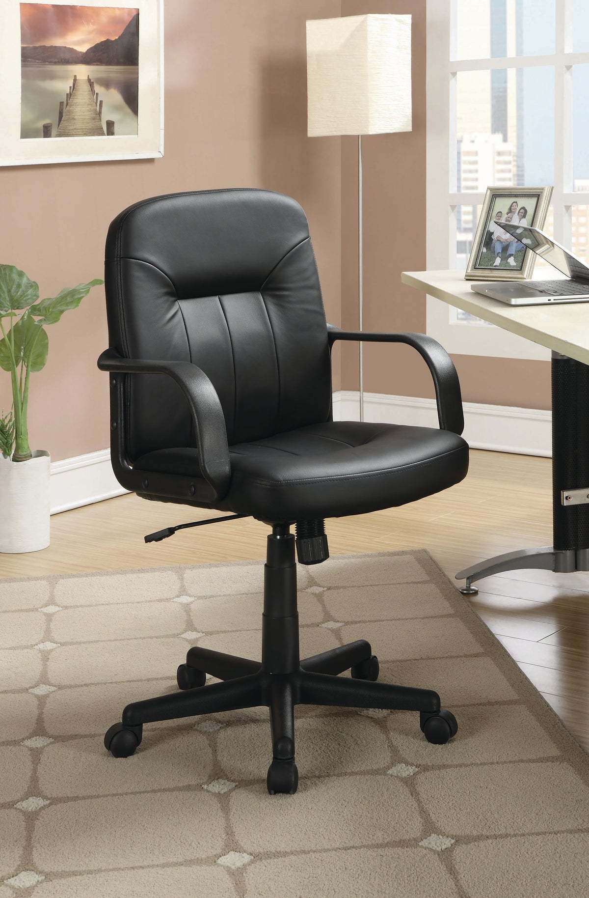 Built to please fans of conventiol taste, this office chair is an easy choice. Stylish and comfortable, its simple profile features gentle contouring to accommodate ergonomic resting positions. Sloped arms with a low profile fit easily under most desk surfaces. Adjustable height settings and caster wheel bases ensure positioning and portability. With black leatherette upholstery, it's both a classic and a beauty.