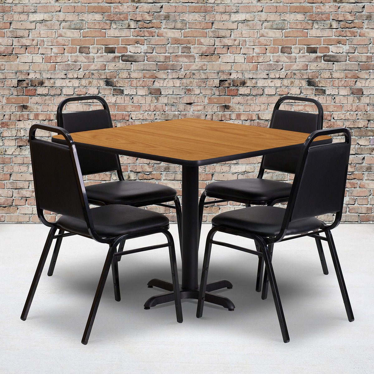 Flash Furniture Carlton 36'' Square Natural Laminate Table Set with X-Base and 4 Black Trapezoidal Back Banquet Chairs