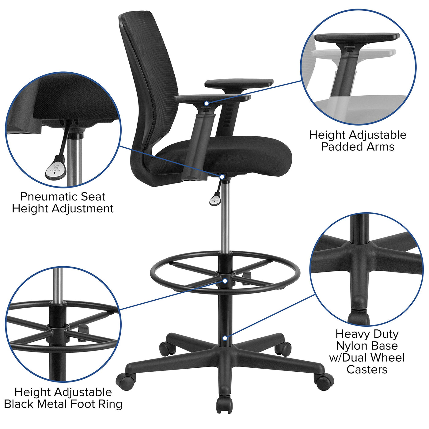 Flash Furniture Harper Ergonomic Mid-Back Mesh Drafting Chair With Black Fabric Seat, Adjustable Foot Ring And Adjustable Arms