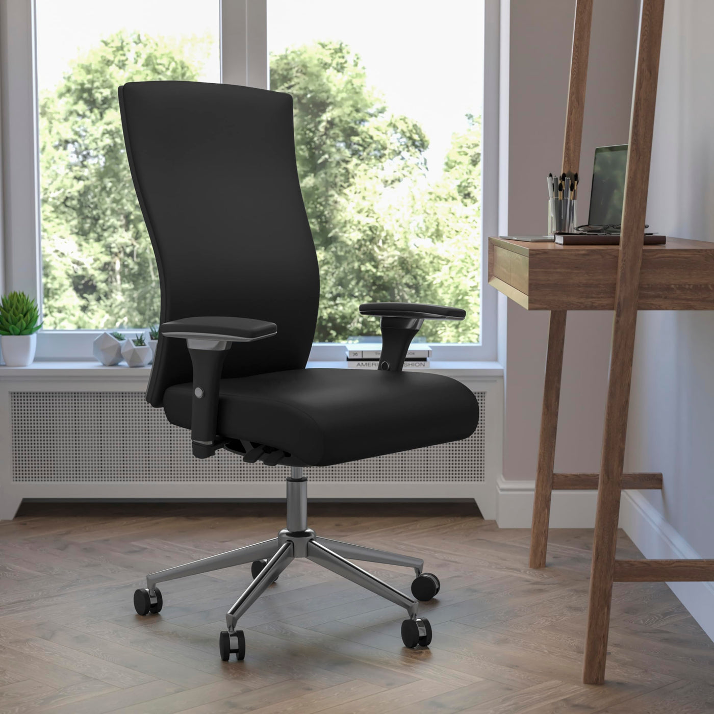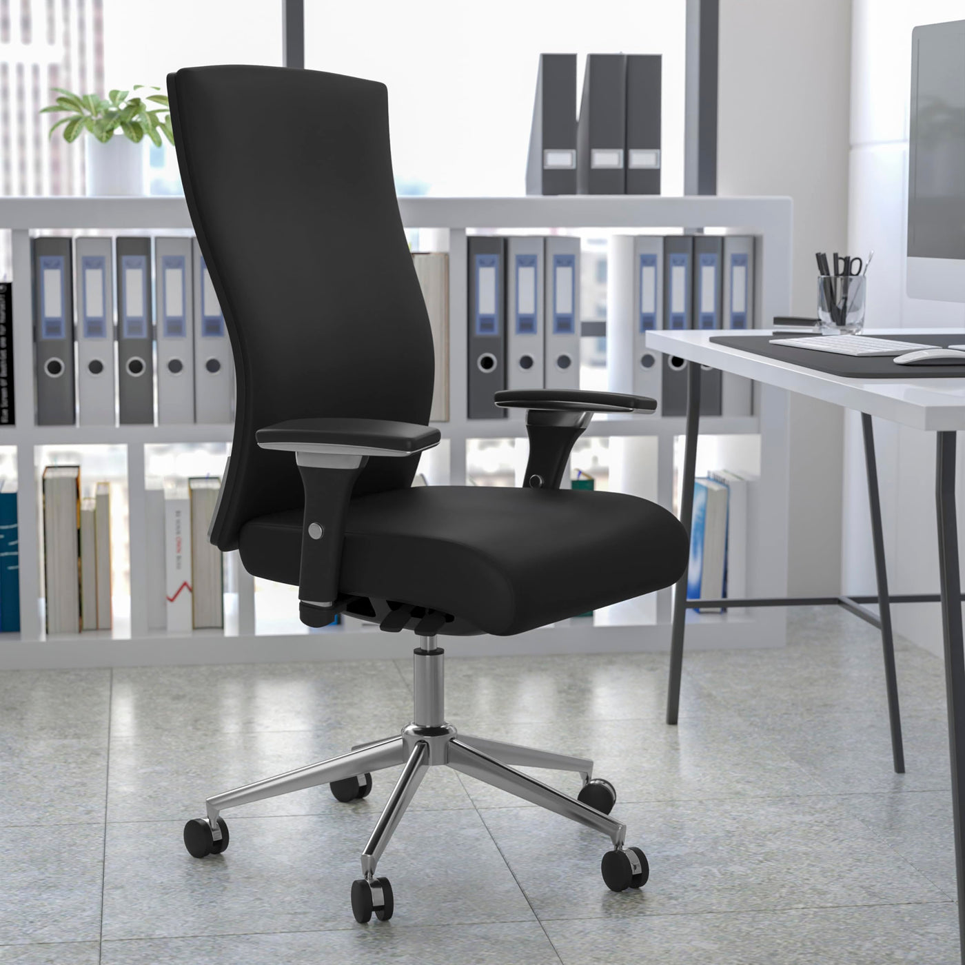 This chair was designed to meet your around the clock needs. Also known as multi-shift task chairs, a 24-hour office chair is designed for extended use or multiple-shift environments. This chair can be used in a 9-5 setting, but it was specifically designed to meet the needs of workers in 911 dispatch offices, nurses' stations, call centers, control room engineers, disc jockeys, and government personnel. This chair has been tested to hold a capacity of up to 300 lbs. Finding a comfortable chair is essential when sitting for long periods at a time. Having the support of an ergonomic office chair may help promote good posture and reduce future back problems or pain. High back office chairs have backs extending to the upper back for greater support. The high back design relieves tension in the lower back, preventing long term strain. The synchro tilt control allows the chair's back and seat to recline at different rates, increasing the angle between your torso and thighs. The seat depth adjustment changes the depth of the seat to accommodate the length of your thighs. Changing the seat depth keeps your back in contact with the backrest while avoiding pressure behind your knees. The waterfall front seat edge removes pressure from the lower legs and improves circulation. Chair easily swivels 360 degrees to get the maximum use of your workspace without strain. The pneumatic adjustment on this chair offers a very smooth adjustment range to achieve your desired height. The adjustable armrests take the pressure off the shoulders and the neck, which minimizes the risk of pain. The arm pads also pivot inward and outward for greater customization. The heavy duty chrome base is constructed to keep up with the demands of an intensive use chair. The beloved LeatherSoft upholstery will add an upscale appeal to your office.