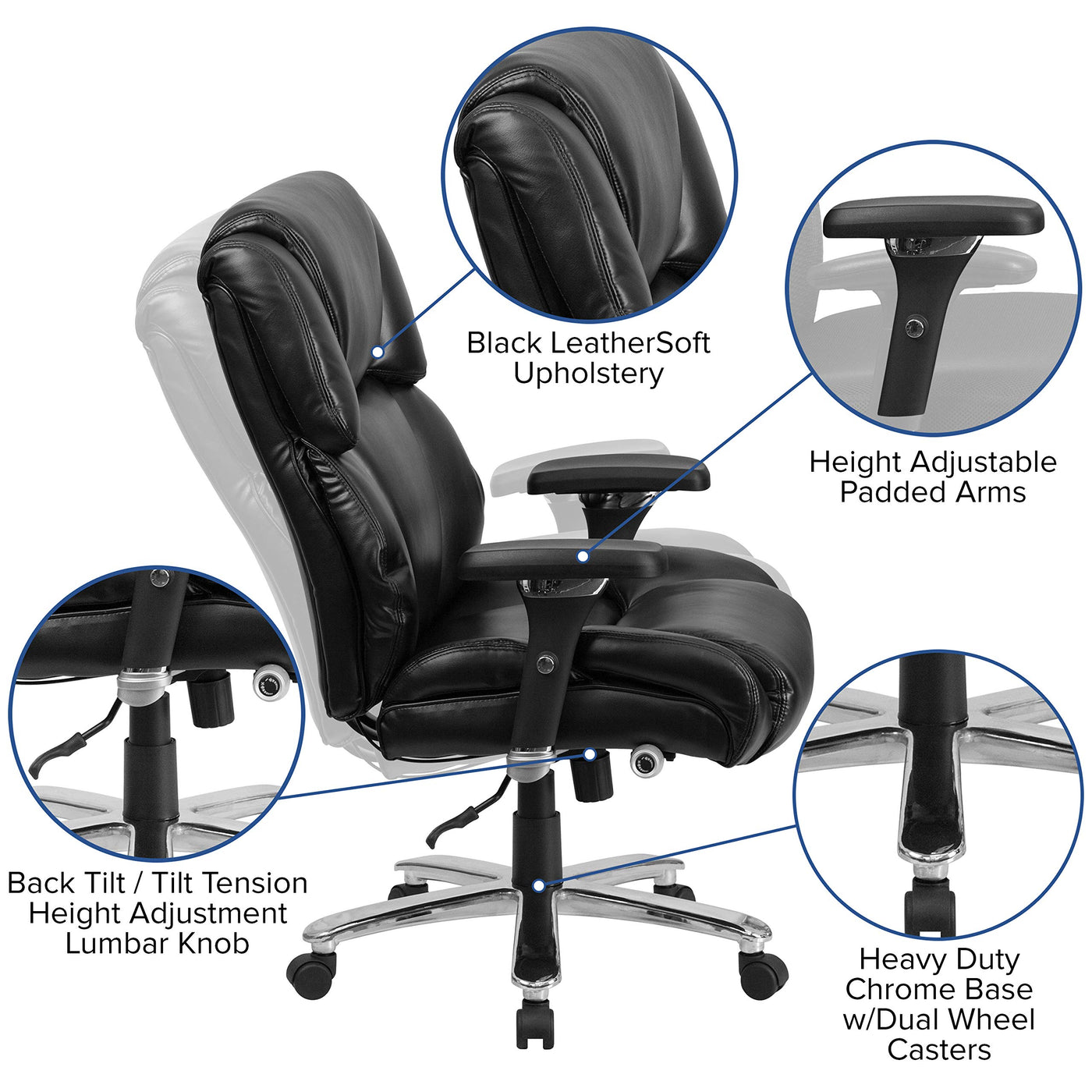 Amplify any office or workspace with the comfort and simplistic style of the Flash Furniture Hercules Series 24/7 Intensive Use Big & Tall Swivel Office Chair. This ergonomic high-back swivel office chair provides exceptional seating for everyone from the CEO to the front office staff, ensuring the perfect balance of ergonomic comfort and optimal support for each employee. Packed with ergonomic features, the 24" wide seat is double padded with 4" of foam and upholstered with soft and durable LeatherSoft material, and the generously padded arms reduce pressure on the shoulders and neck providing additional comfort. The high back design extends to the upper back for maximum support and tension relief in your lower back to prevent long-term strain, and the included headrest takes the pressure off of your neck as you lean back. Additionally, the highly customizable office chair features a pneumatic height adjustable swivel seat and has a tilt lock mechanism that offers a comfortable rocking/reclining motion, creating a custom seating experience for all body types. This sturdy office chair measures 30"W x 34"D x 44-48"H and can be assembled quickly with the included tools and step-by-step instructions. As needed, the low-maintenance swivel office chair can be wiped down with a damp cloth for quick and easy cleaning.