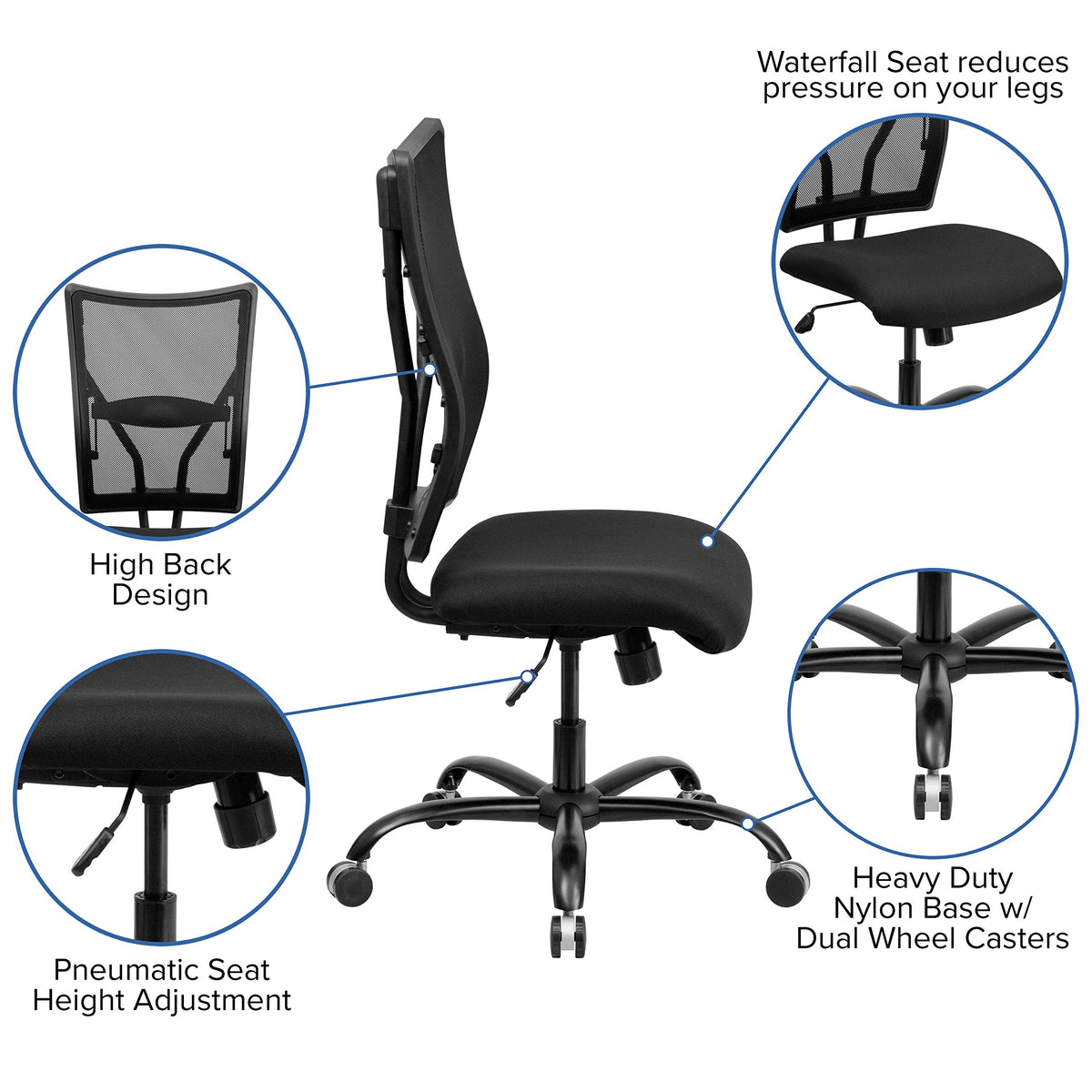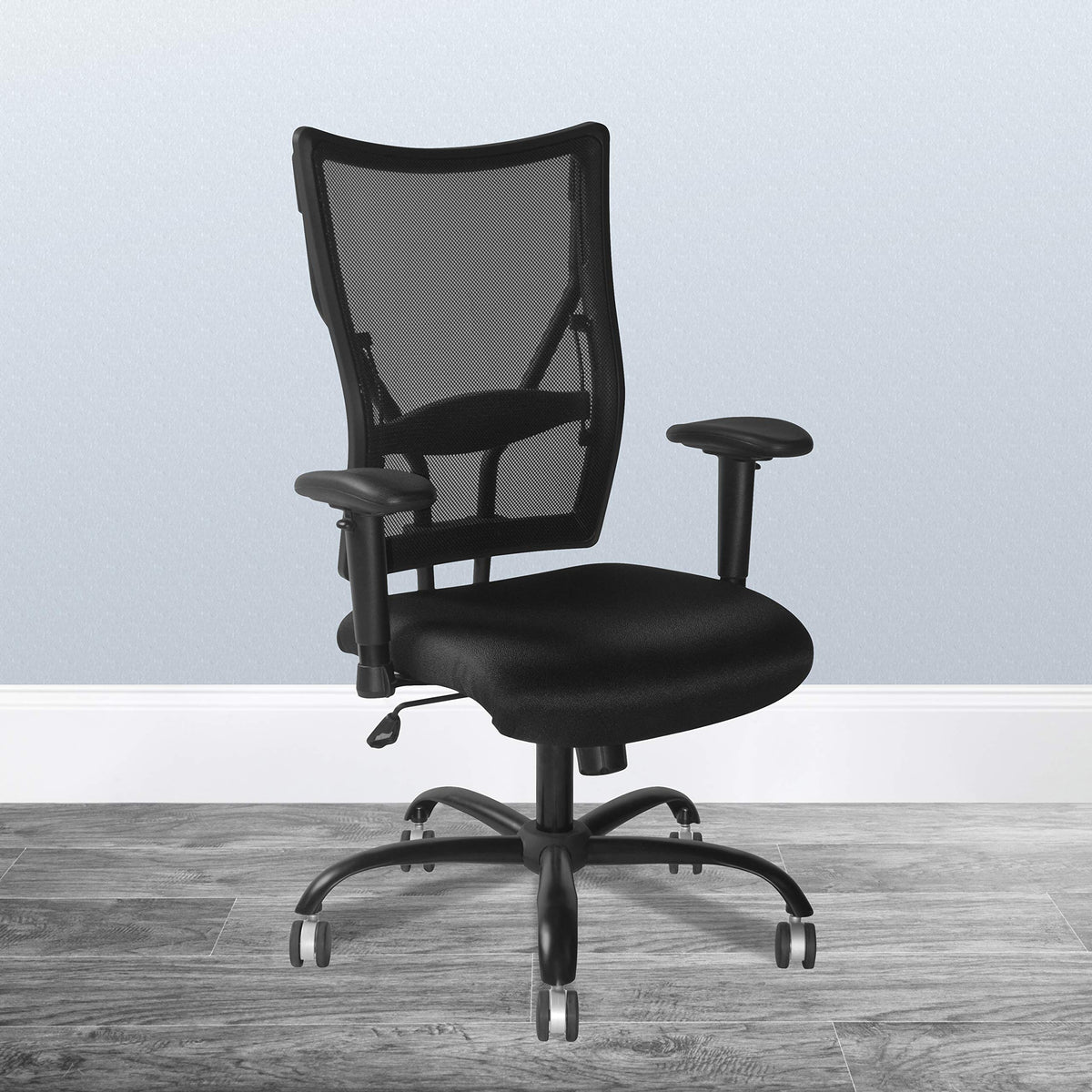 Finding a comfortable chair is essential when sitting for long periods at a time. This Big & Tall office chair is designed to accommodate larger and taller body types and has been tested to hold a capacity of up to 400 lbs., offering a broader seat and back width. High back office chairs extend to the upper back for greater support and relieve tension in the lower back, preventing long term strain. Mesh office chairs can keep you more productive throughout your work day with a ventilated back design. The breathable mesh material allows air to circulate to keep you cool. The waterfall front seat edge and extra large, height adjustable chrome foot ring remove pressure from the lower legs and promote better posture. A synchro tilt control allows the chair's back and seat to recline at different rates. Chair easily swivels 360 degrees to get the maximum use of your workspace without strain. This modern chair is sure to make an impact whether it is used in the home or work field.