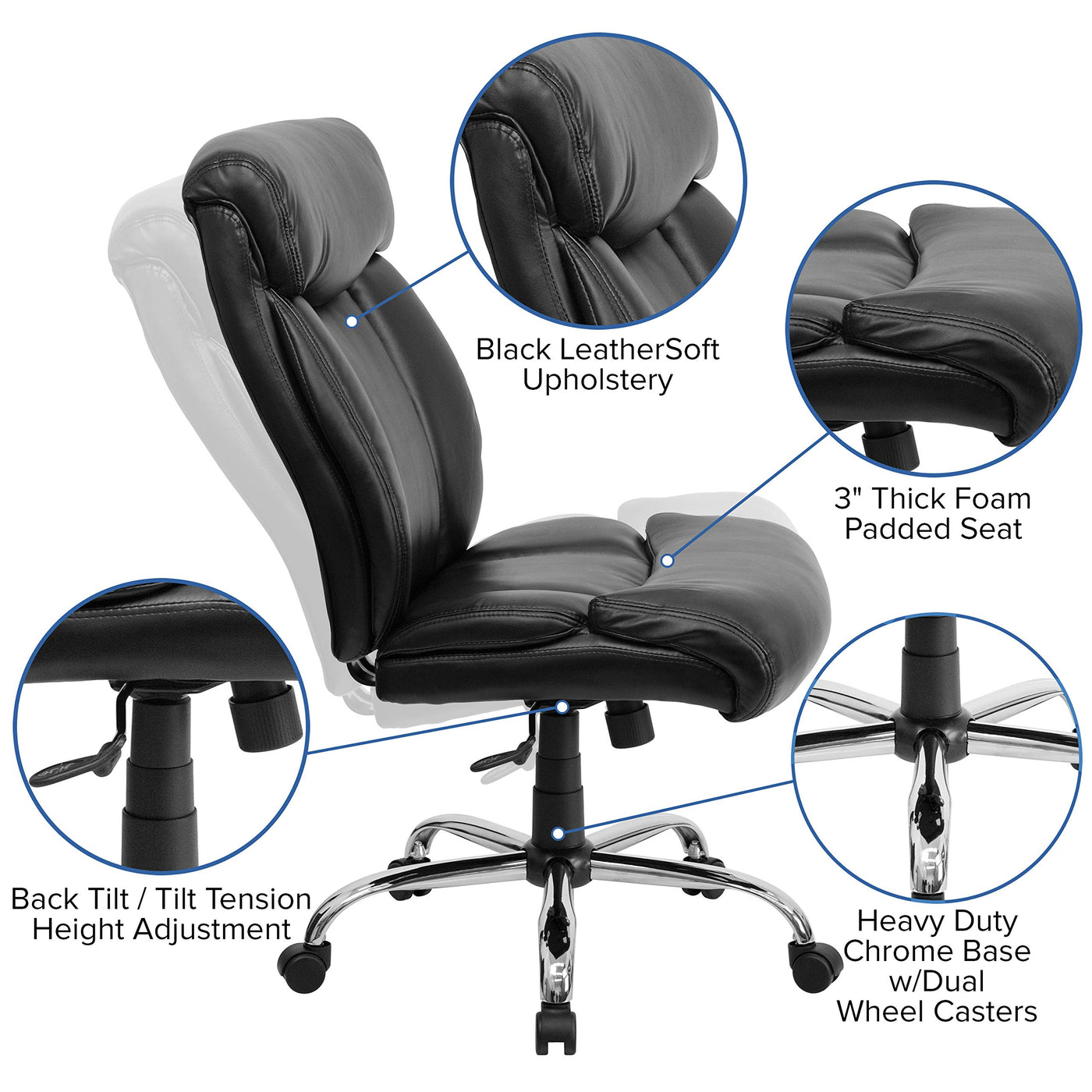 Amplify any office or workspace with the comfort and simplistic style of the Flash Furniture Hercules Series Big & Tall LeatherSoft Executive Office Chair. This ergonomic mid-back swivel office chair provides exceptional seating for everyone from the CEO to the front office staff, ensuring the perfect balance of ergonomic comfort and optimal support for each employee. Packed with ergonomic features, the 22" extra-wide seat is double padded with plenty of thick, plush foam and upholstered with soft and durable LeatherSoft material, and the waterfall front seat edge removes pressure from the lower legs while improving circulation. The high back design extends to the upper back for maximum support and tension relief in your lower back to prevent long-term strain, and the included full headrest allows you to take on even the longest work days in comfort. Additionally, the highly customizable office chair features a pneumatic height adjustable 360-degree swivel seat and has a tilt lock mechanism that offers a comfortable rocking/reclining motion, creating a custom seating experience for all body types. This sturdy office chair measures 29"W x 29"D x 42.5-45.5"H and can be assembled quickly with the included tools and step-by-step instructions.