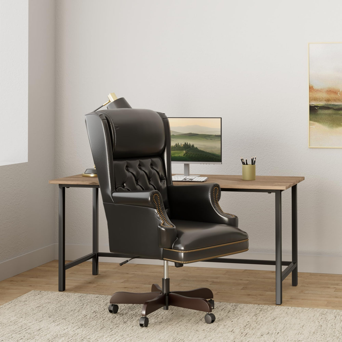 This button tufted black executive office chair combines old world craftsmanship with 21st century ergonomic seating principles, giving you a chair that feels as good as it looks. It redefines traditional elegance with its softer edges, subtle styling, and amazing comfort. The generously padded headrest will take the pressure off of your neck while leaning back. High back office chairs extend to the upper back for greater support and relieve tension in the lower back, preventing long term strain. Chair easily swivels 360 degrees to get the maximum use of your workspace without strain. The pneumatic adjustment lever will allow you to easily adjust the seat to your desired height. The rolled arms are adorned with individual brass nail trim. The heavy duty mahogany wood capped base adds to the traditional, elegant styling of this chair.