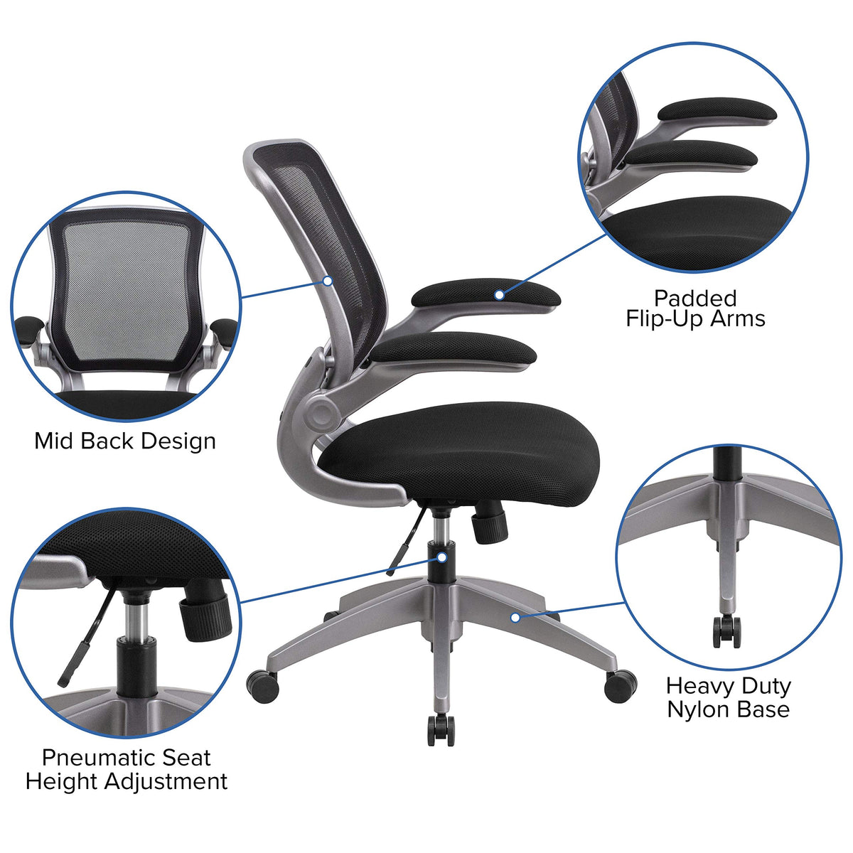 Flash Furniture Kale Mid-Back Black Mesh Swivel Ergonomic Task Office Chair with Gray Frame and Flip-Up Arms