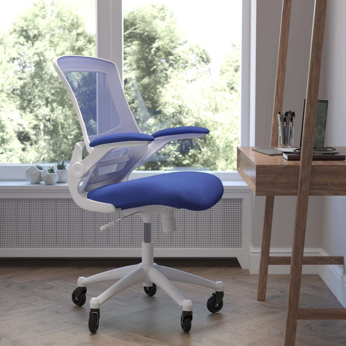 Flash Furniture Kelista Mid-Back Blue Mesh Swivel Ergonomic Task Office Chair With White Frame, Flip-Up Arms, And Transparent Roller Wheels
